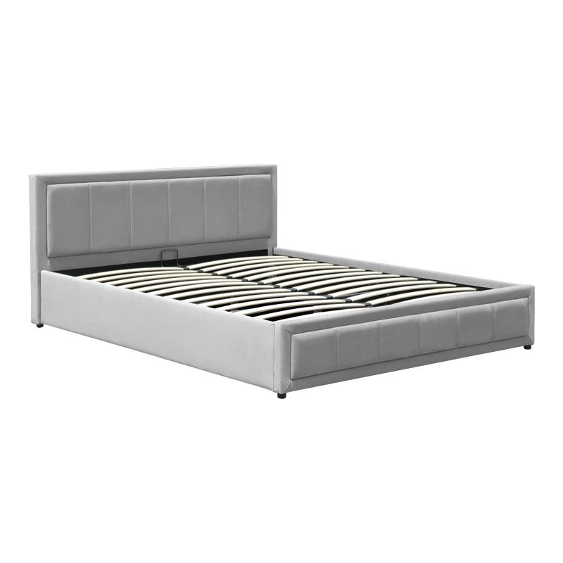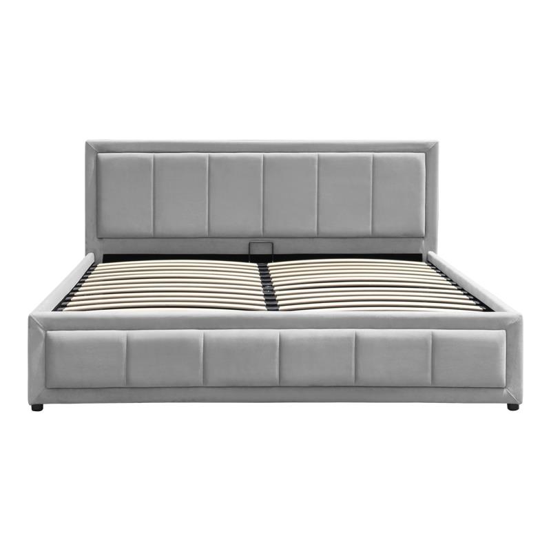 The elegant and practical Huga bed is an excellent solution for any bedroom, offering both comfort and smart storage space. Its construction, upholstered with high-quality velvet, provides a modern and sophisticated aesthetic that seamlessly integrates with all decor styles. It features an easy-to-use mattress lift mechanism, which reveals a spacious storage area underneath. This makes it easy to organize linens, pillows, out-of-season clothing, or other items, contributing to the organization and tidiness of the space. The headboard, with its discreet yet modern design, adds a touch of luxury and comfort, while its neutral shade ensures the bed's versatility to combine with various colorful decorative elements.