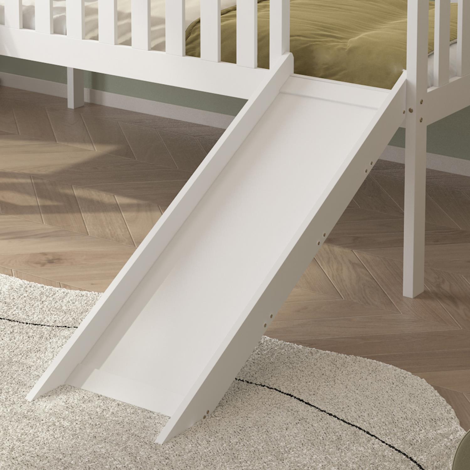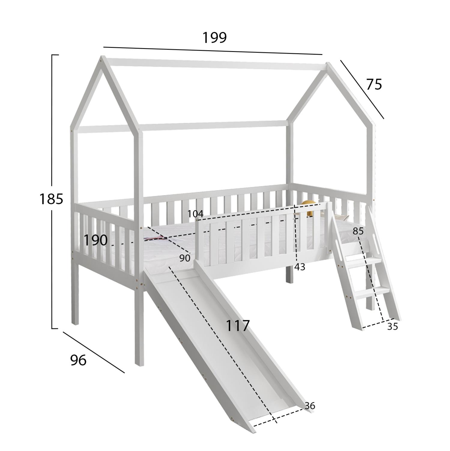 The PHYLLIS Montessori-type children's bed in dimensions for a mattress of 90x190cm, is made of pine wood in WHITE color. The entire bed is raised and has the shape of a house, but what makes children love it is that it has a slide, offering endless hours of play and joy. Access to the bed is via a small ladder, also serving the purpose of the slide, while the mattress is placed on plywood boards.