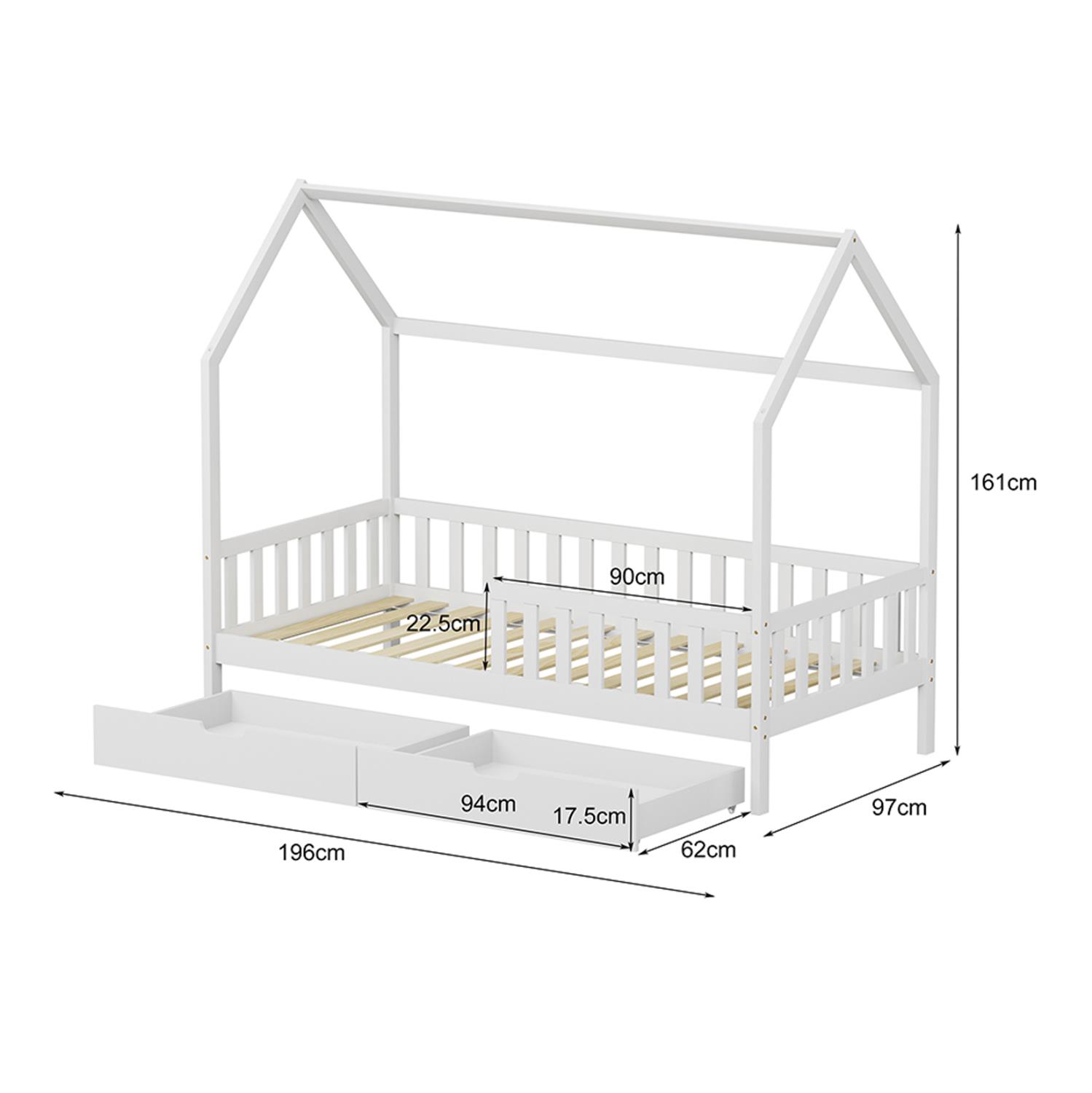 It features two practical sliding drawers under the bed. It is sized for a single mattress 90x190 cm and is an excellent quality, modern and safe choice for the children's room since it has a wooden railing around the perimeter.