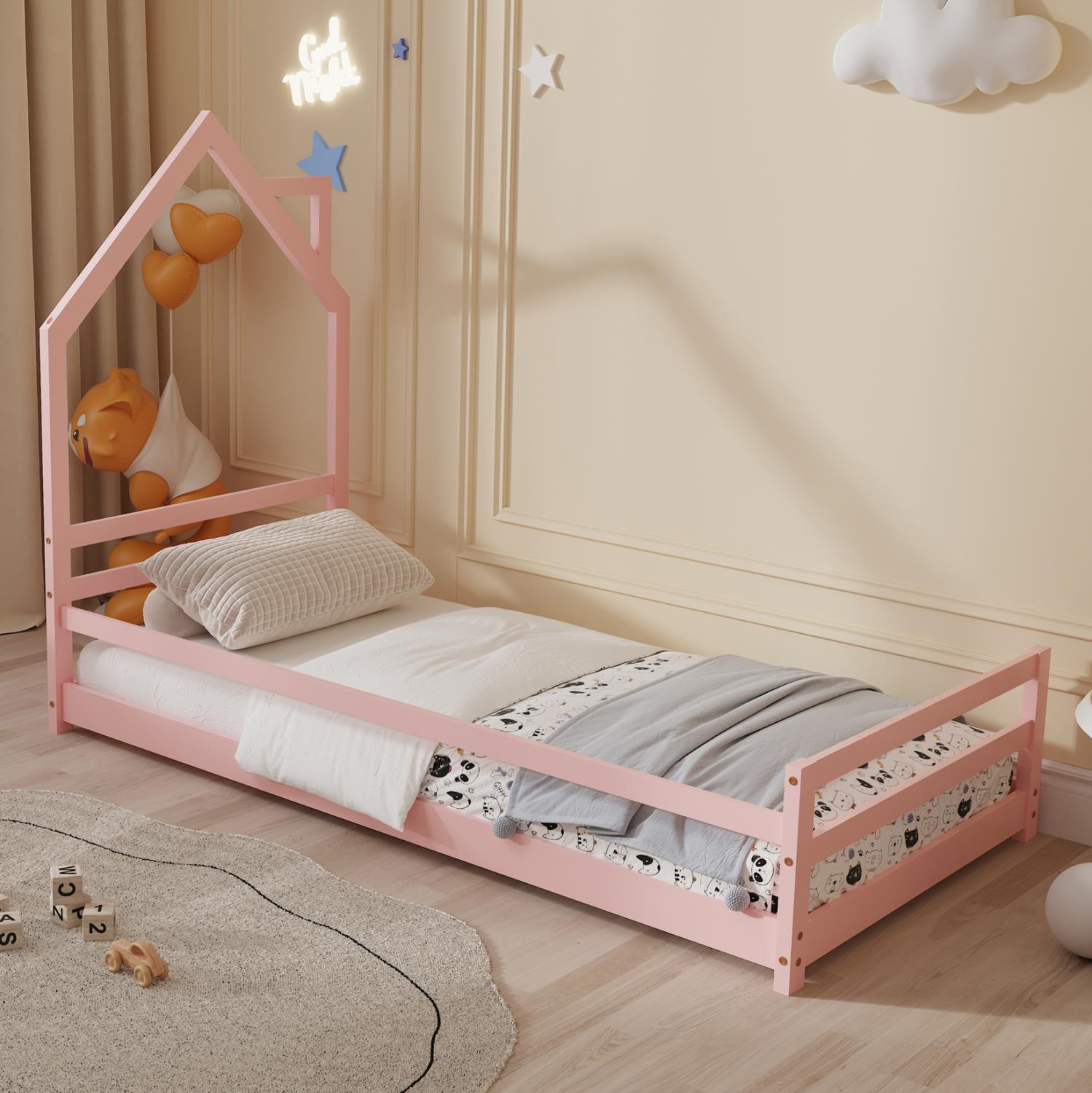 The HOUSER Montessori-type children's bed in dimensions for a mattress of 90x190cm, is made of pine wood in PINK color. The headboard is shaped like a house with a chimney, and the legs are extremely low, while the mattress is placed on plywood boards.