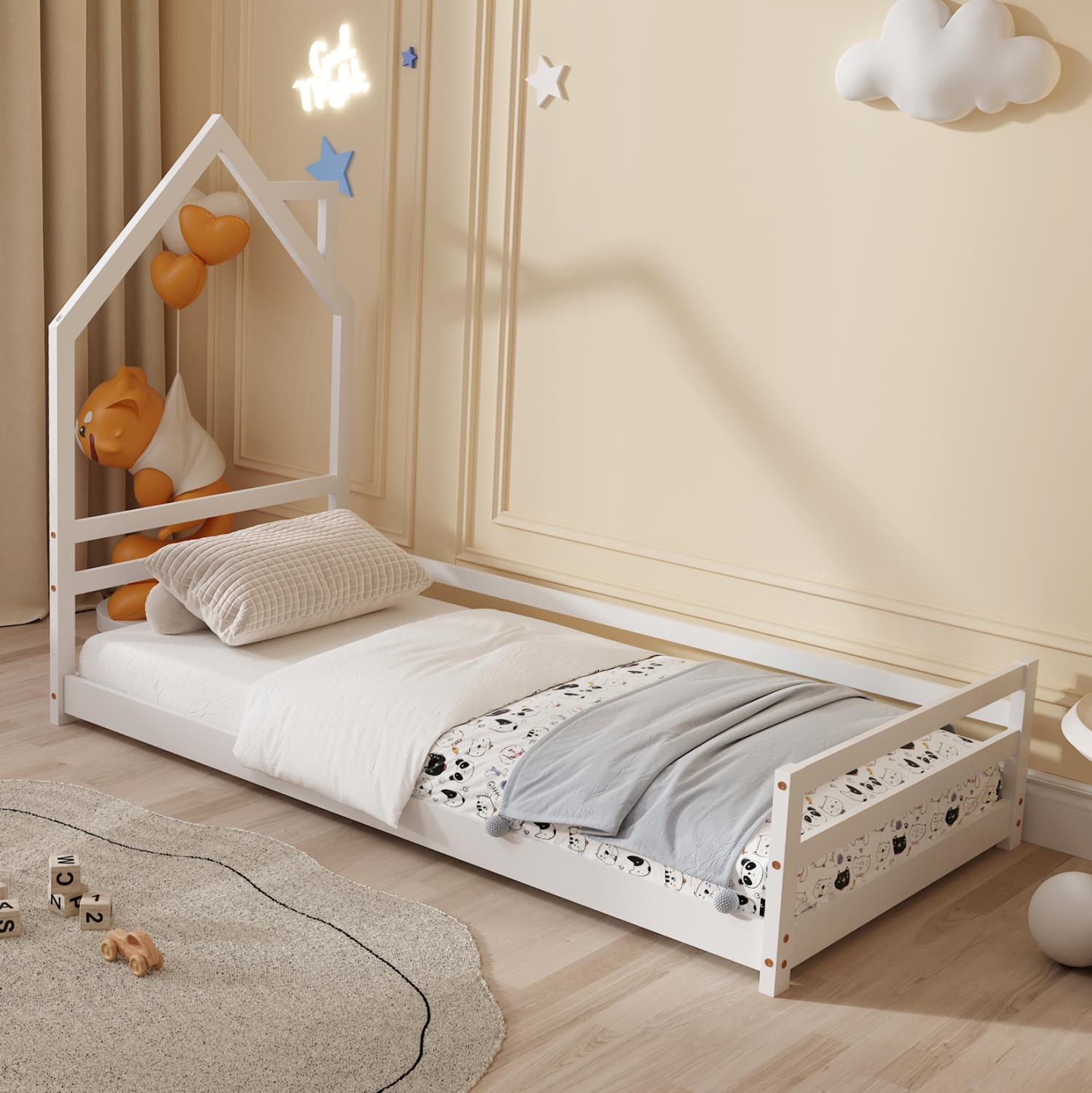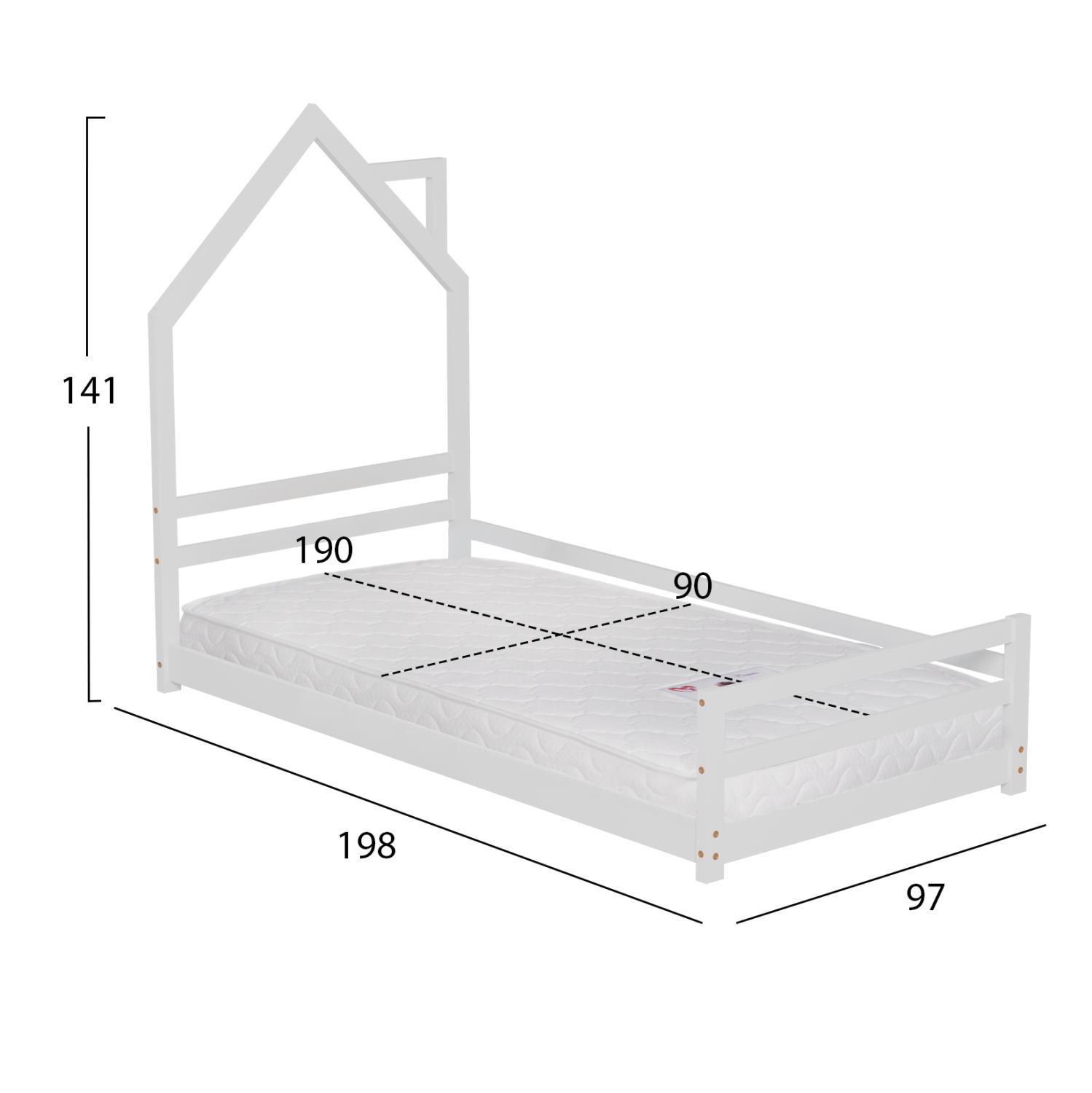 The HOUSER Montessori-type children's bed in dimensions for a mattress of 90x190cm, is made of pine wood in WHITE color. The headboard is shaped like a house with a chimney, and the legs are extremely low, while the mattress is placed on plywood boards.