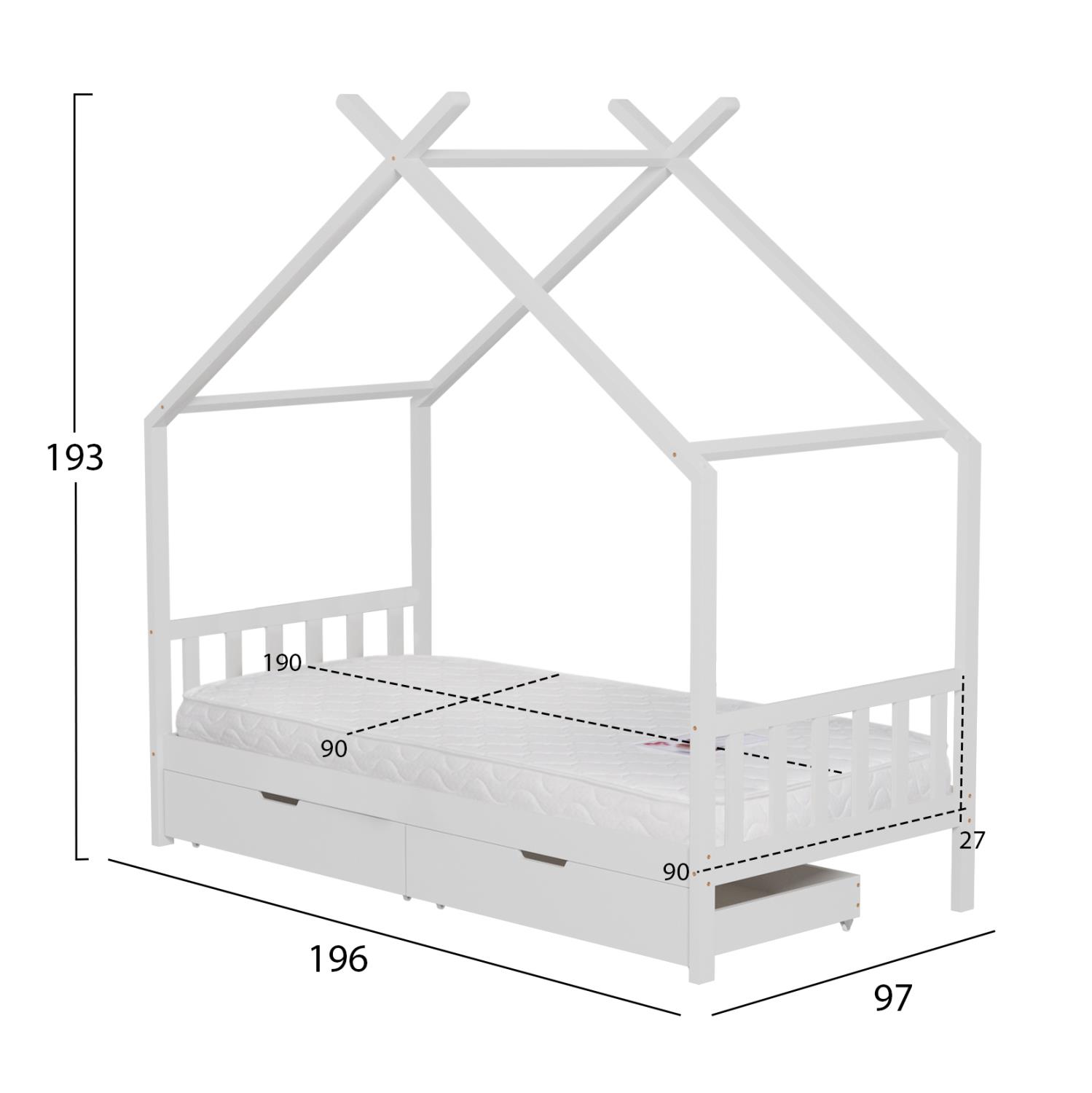 The KLARICE Montessori-type children's bed in dimensions for a mattress of 90x190cm, is made of pine wood in WHITE color. The entire bed is shaped like a house and has 2 drawers at the bottom for storage as well as protective railings on 2 sides, while the mattress is placed on plywood boards.