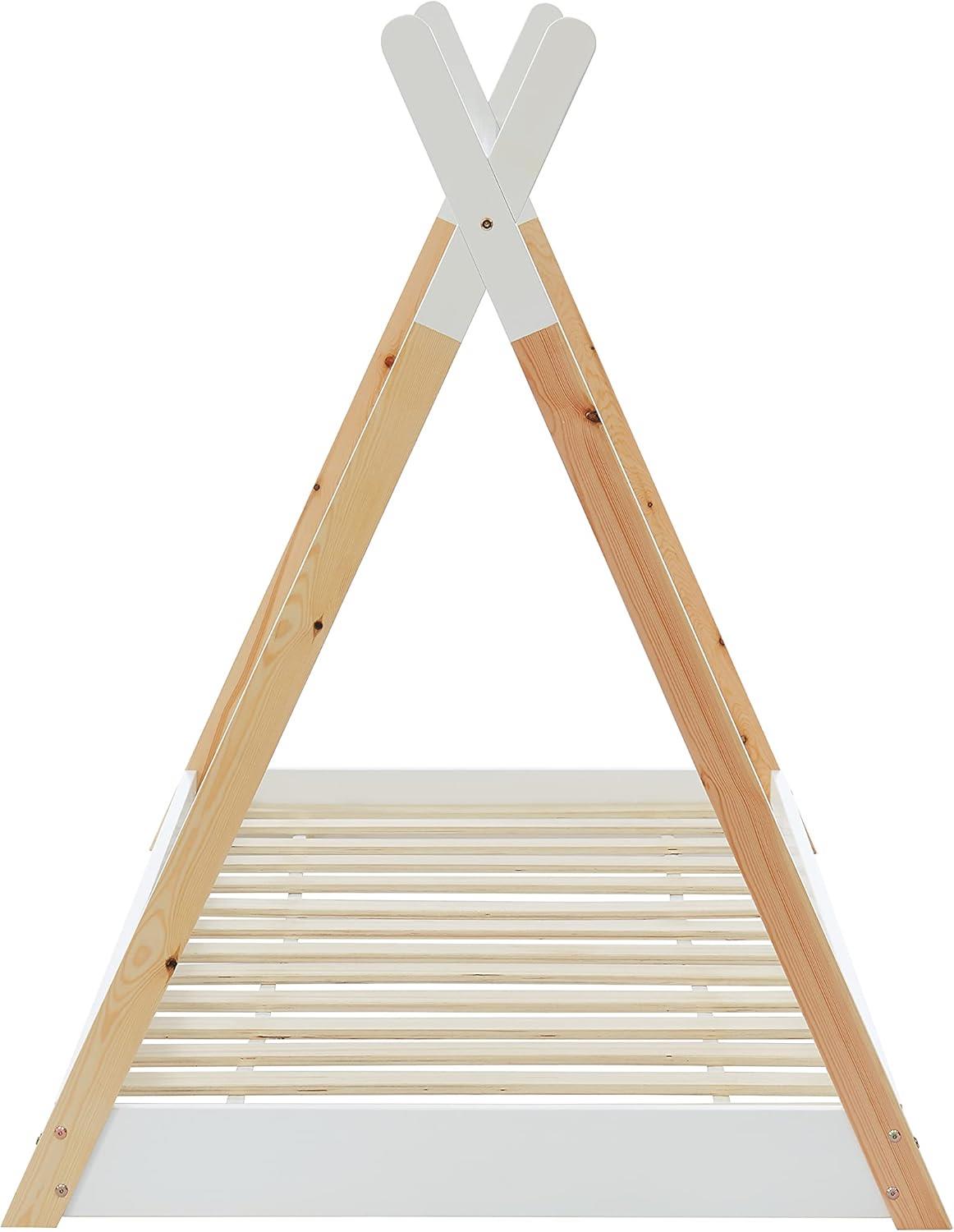 The MUNK Montessori-type children's bed in dimensions for a mattress of 90x190cm, is made of pine wood in NATURAL/WHITE two-tone coloring. The bed is tent-shaped and has extremely low legs, while the mattress is placed on plywood boards.