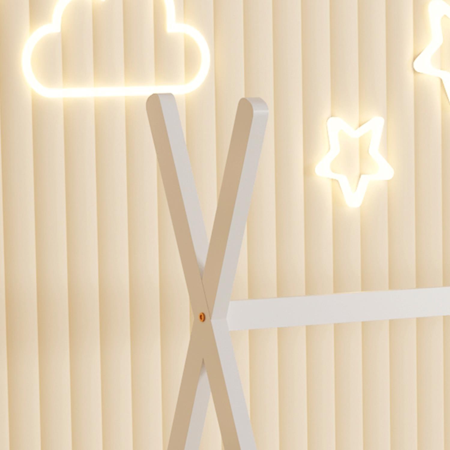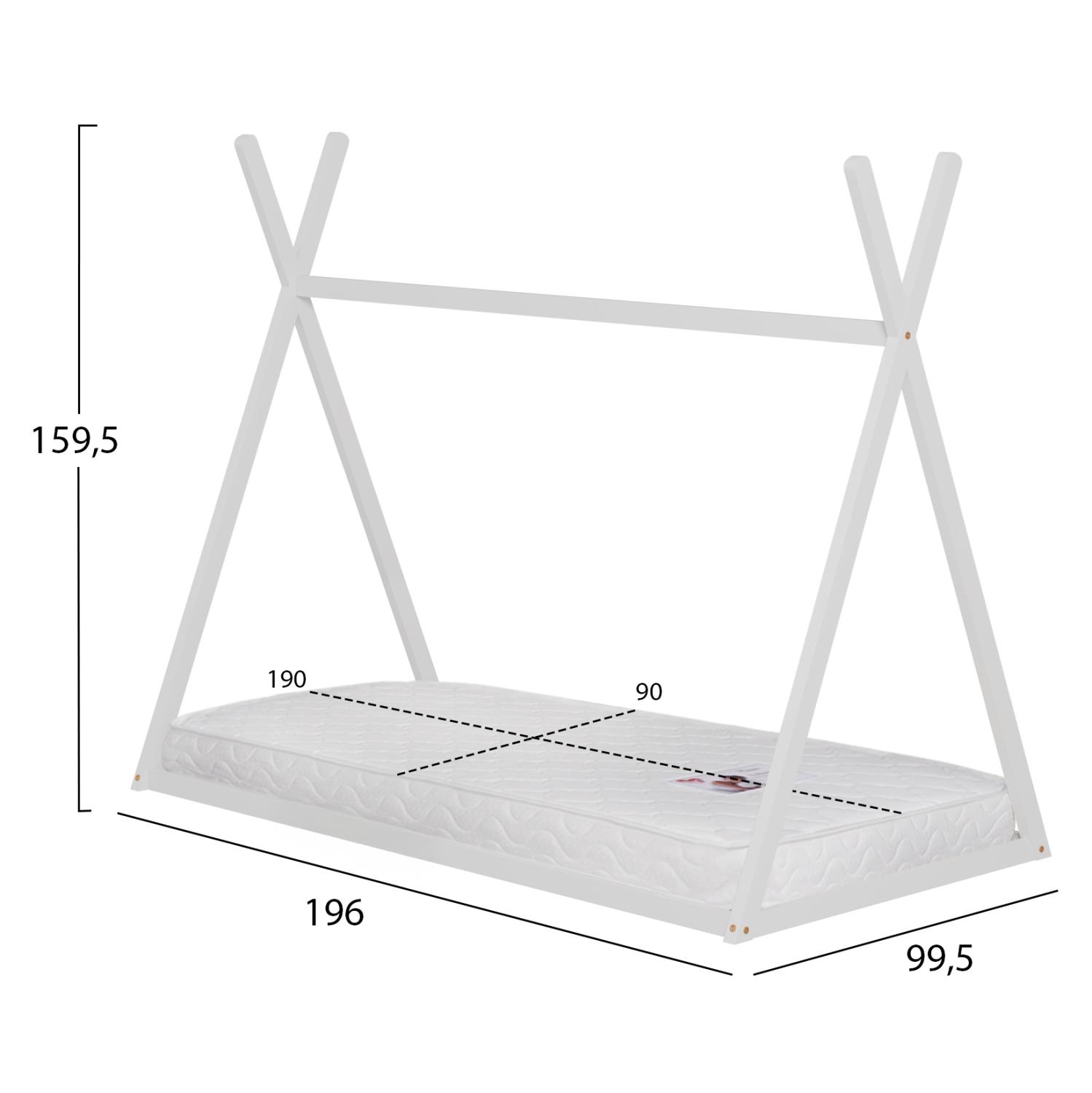 The MUNK Montessori-type children's bed in dimensions for a mattress of 90x190cm, is made of pine wood in WHITE color. The bed is shaped like a camp tent, while the mattress is placed on plywood boards.