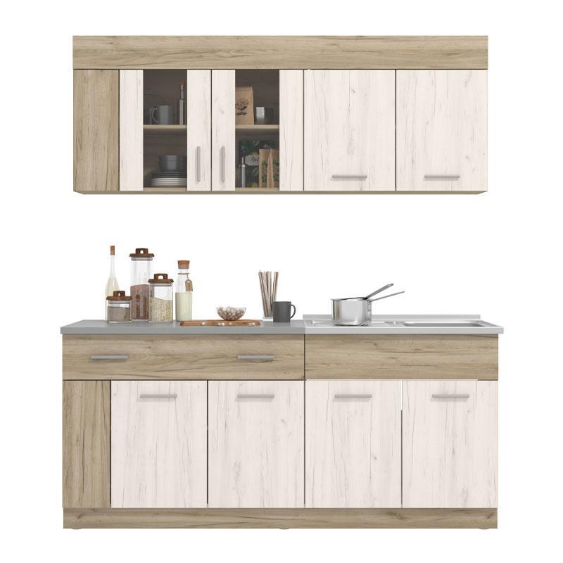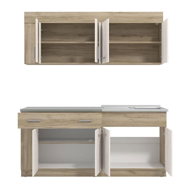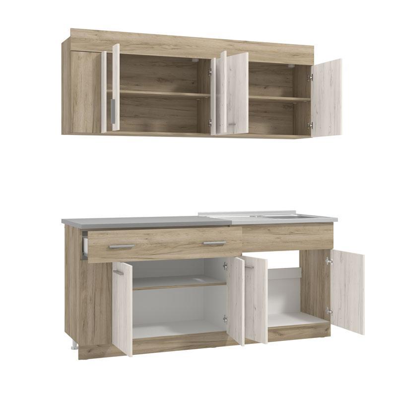 The ready-made Leona 180 kitchen set in an elegant combination of grey oak and white oak shades has been designed to offer practicality and aesthetic harmony in the decoration of your space. Designed to meet your every aesthetic and practical need, this kitchen set offers plenty of storage space, consisting of 2 wall cabinets and 2 floor cabinets, one of which has a drawer with a cabinet below, as well as a cabinet for installing a sink.