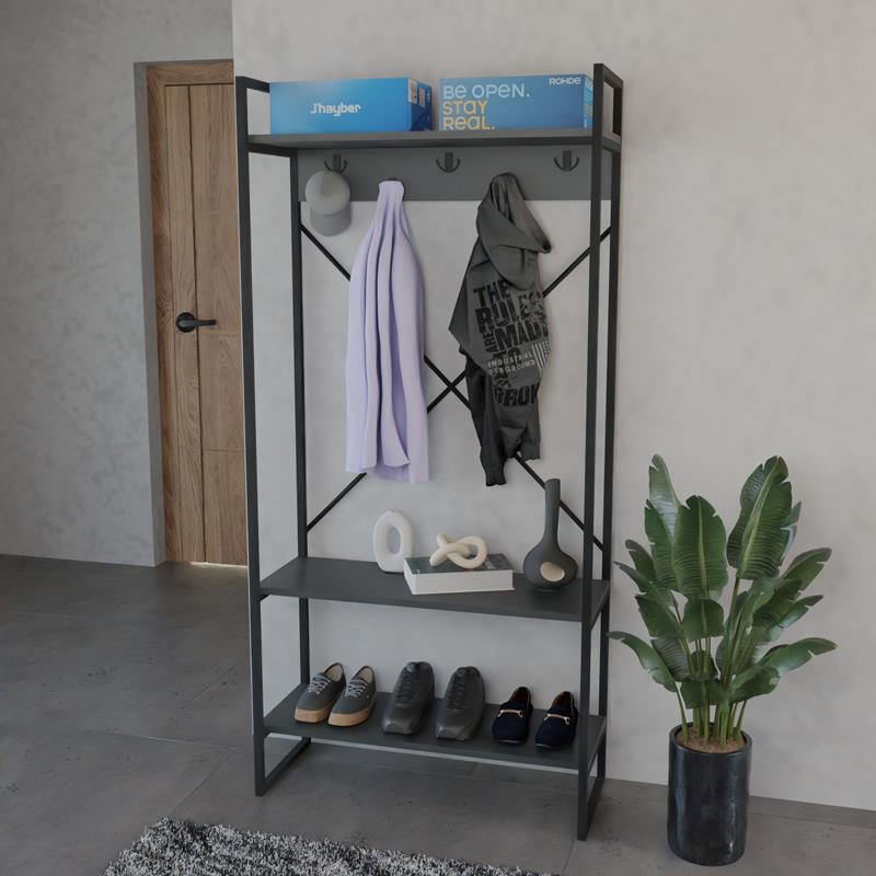Designed to meet all your everyday needs, this piece of furniture offers a complete storage solution. Hang coats, scarves, and bags on the integrated hooks, neatly arrange your shoes on the bottom shelf, and use the upper shelves to add a personal touch with decorative items or books.