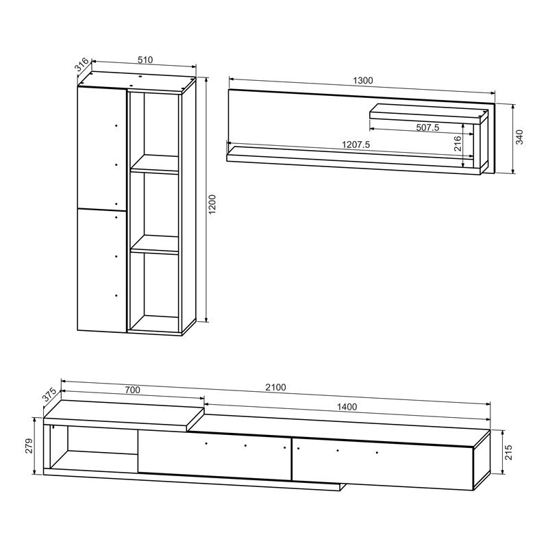 • The living room unit includes a TV stand, a vertical bookshelf, and a wall-mounted shelf. Each piece is independent and can be positioned as desired, at any height that suits your living space.