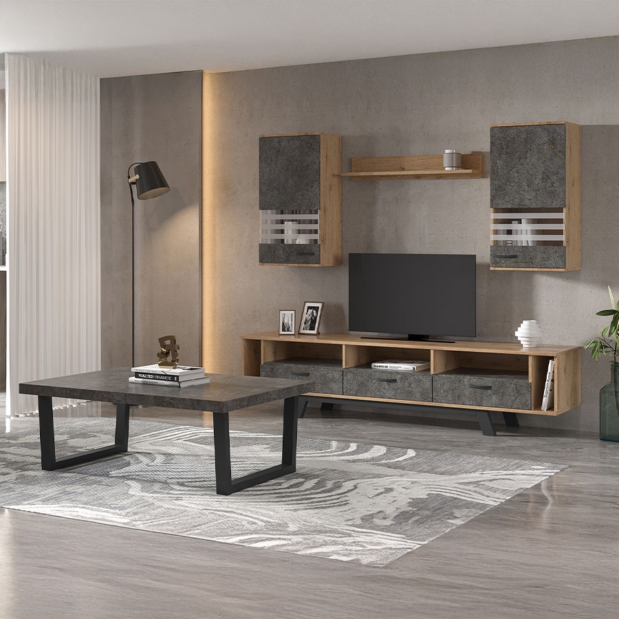 The BRIGET living room set is an ideal choice for those who want an elegant, functional space in their living room, featuring a TV stand with metal legs, which features 5 open storage spaces for your electronic items, books and/or decorations, as well as three drawers to keep your items organized. In addition, the set also features two hanging glass display cases and a shelf.
