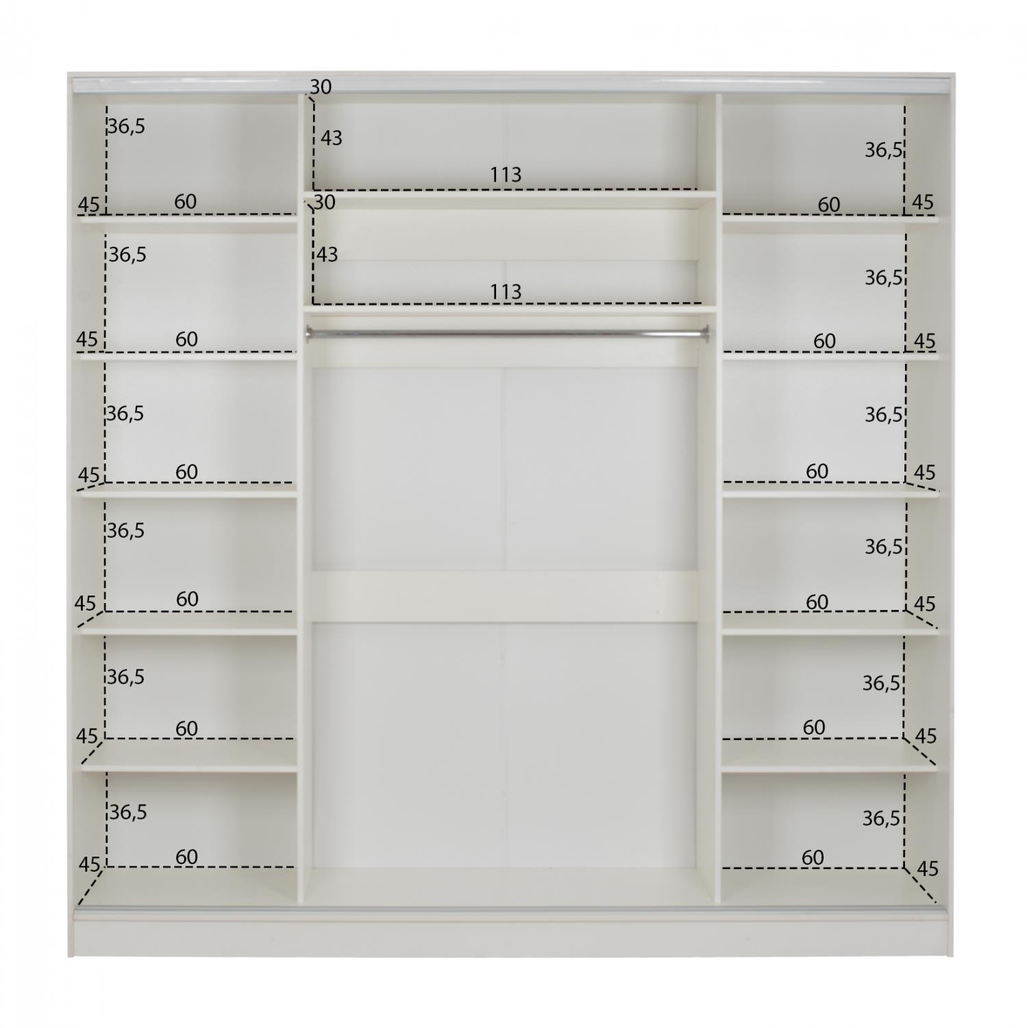 The bedroom wardrobe has a simple design and its interior includes shelves on both ends, right and left, which create 6 spacious shelves for storage.