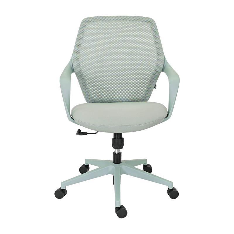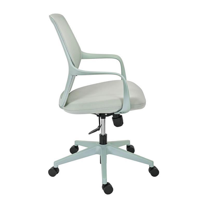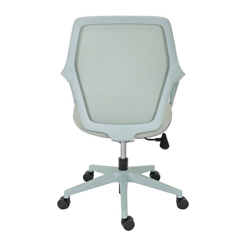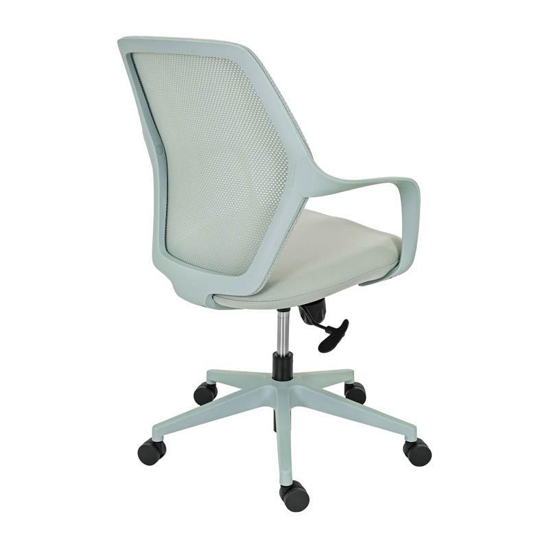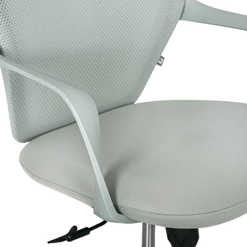 The back of the chair is made of durable mesh, which allows proper air circulation. This breathable construction helps maintain a cool and pleasant feeling in the back area, even after many hours of work. At the same time, the seat is upholstered in high-strength fabric, offering comfort and stability during daily use, while maintaining its quality over time.