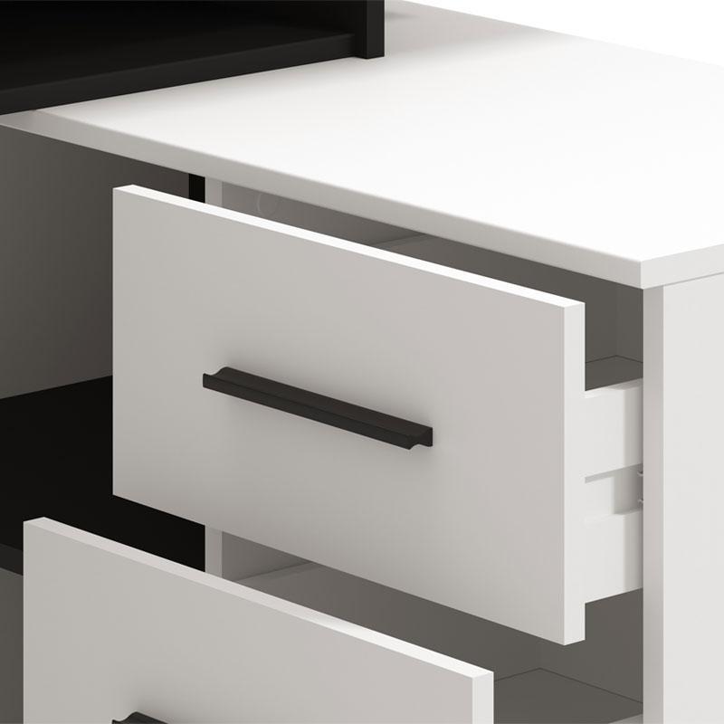 Add style and prestige to your space with the Arhimed corner desk, in a bright and modern white with black shade. Ideal for any workspace, or even home office spaces. For those of you who value practicality and aesthetics. The spaces on its right side further contribute to the organization and arrangement of your personal belongings.