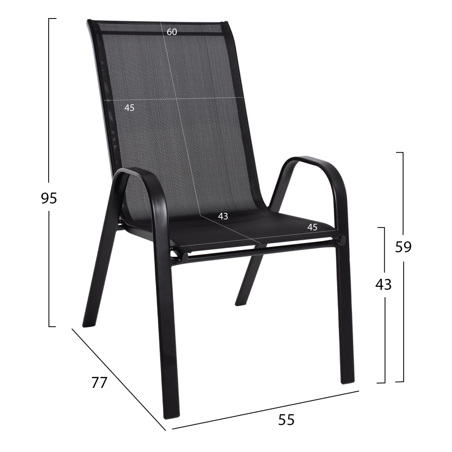 The LEON armchair in BLACK color is modern, comfortable, and stable! The back and seat are made of a single piece of textilene, while the arms are low, essentially forming the upper part of the legs. The characteristic of this armchair is the comfort it offers and pleasantly surprises those who use it. Also, the fact that it is STACKABLE makes it very practical since you can store it in the smallest possible space.