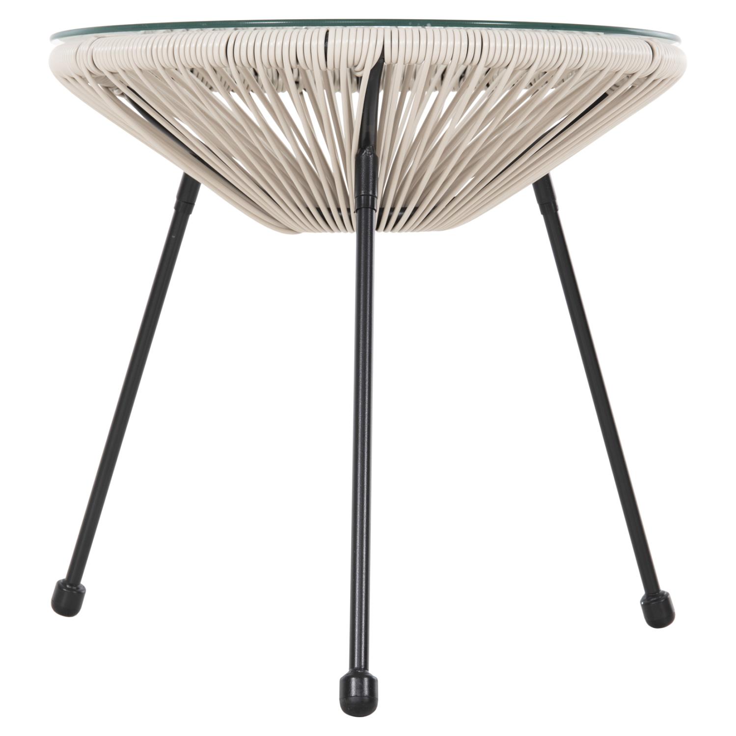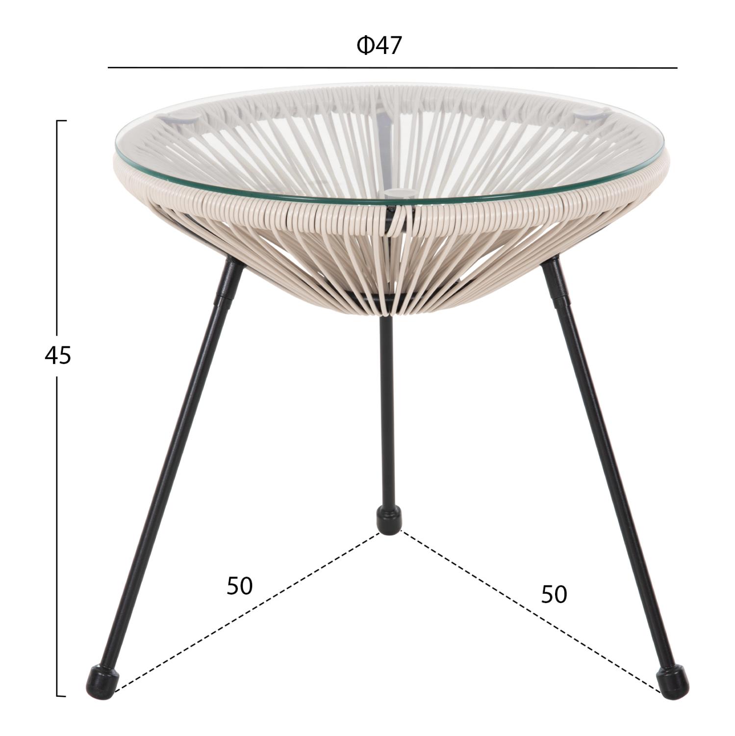 ALLEGRA is a short round side/coffee table, mainly for outdoor use. It rests on a base with 3 black metal legs. The table is conical made of synthetic Rattan in BEIGE color, and its surface is safety glass. A beautiful table, which if combined with chairs of the same series will be an amazing part of your space.