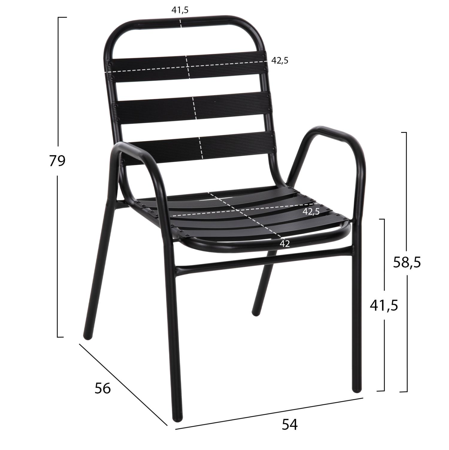 This Outdoor Dining Set features a table with a BLACK metal frame and a REINFORCED glass opaque tabletop, and 4 stackable metal armchairs with a seat & backrest made of aluminum slats in BLACK color.