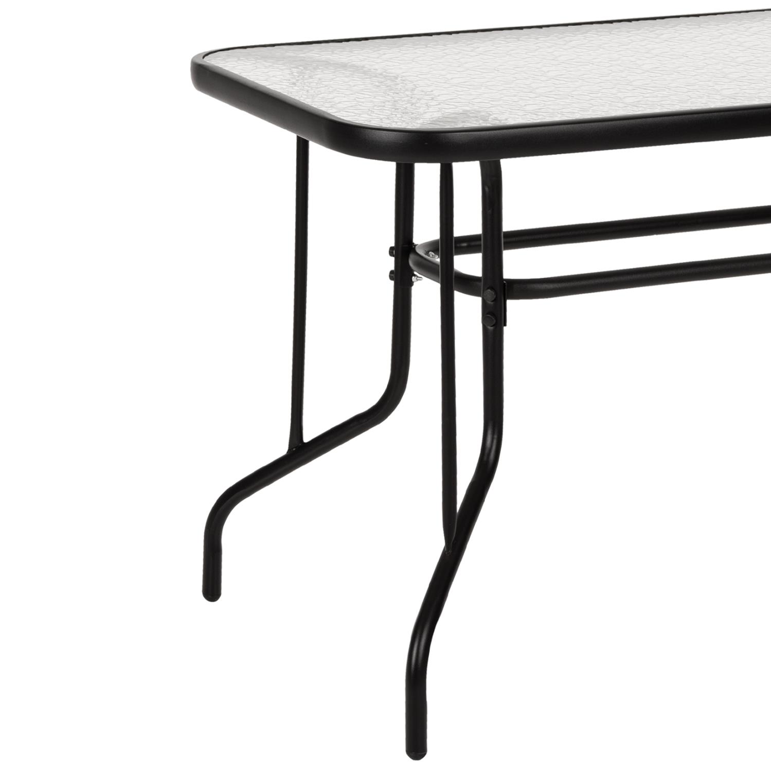 This Outdoor Dining Set features a table with a BLACK metal frame and a REINFORCED glass opaque tabletop, and 4 BLACK metal stackable armchairs with a seat & backrest made of high quality textilene fabric (2x1) in BLACK color.