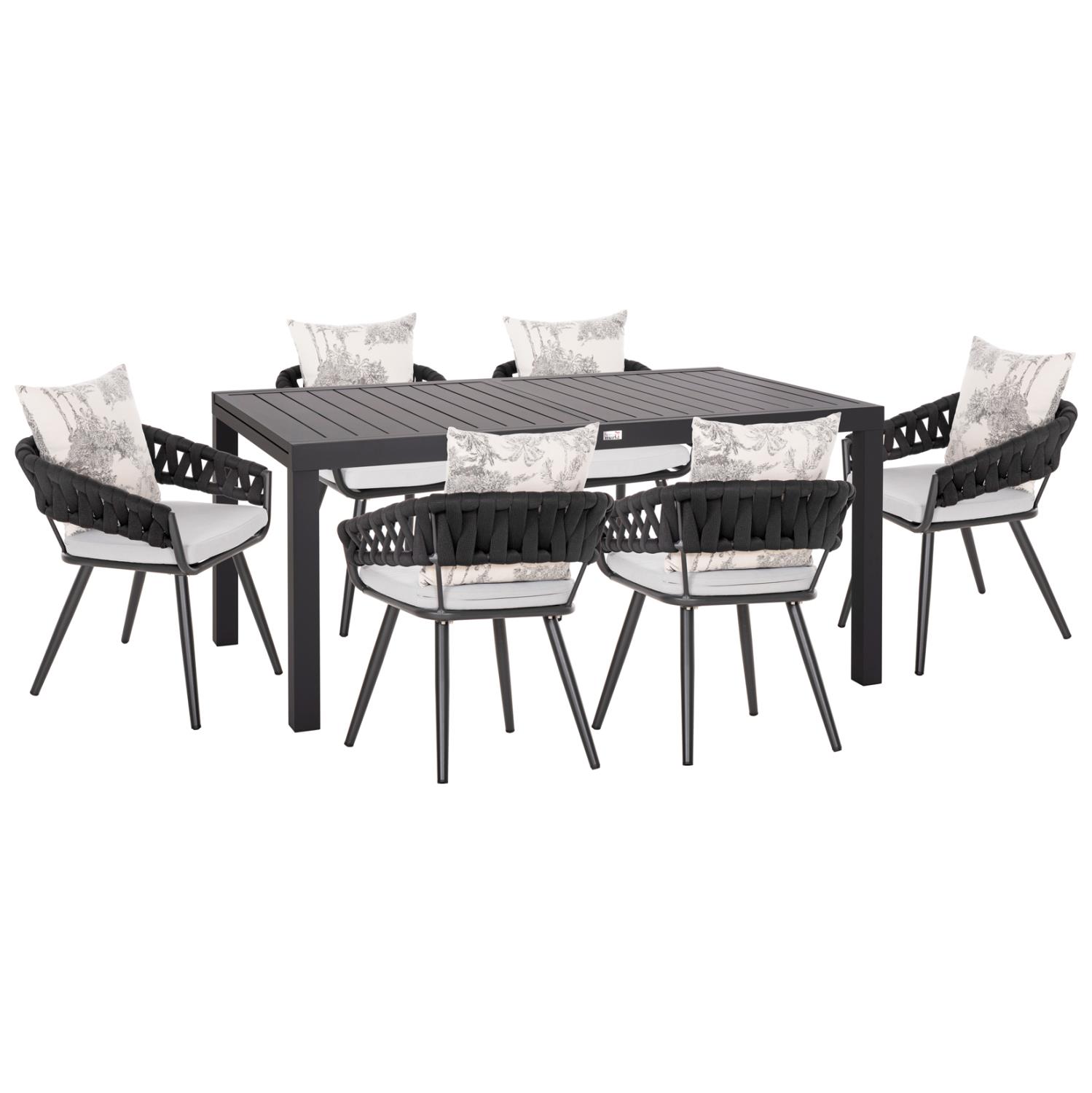 The outdoor dining set KRUM C21156 consists of a DARK GREY extendable aluminum table and 6 DARK GREY aluminum armchairs with CREAM seat cushions and P.E. rope (terylene) upholstery in DARK GREY. The armchairs are stackable.