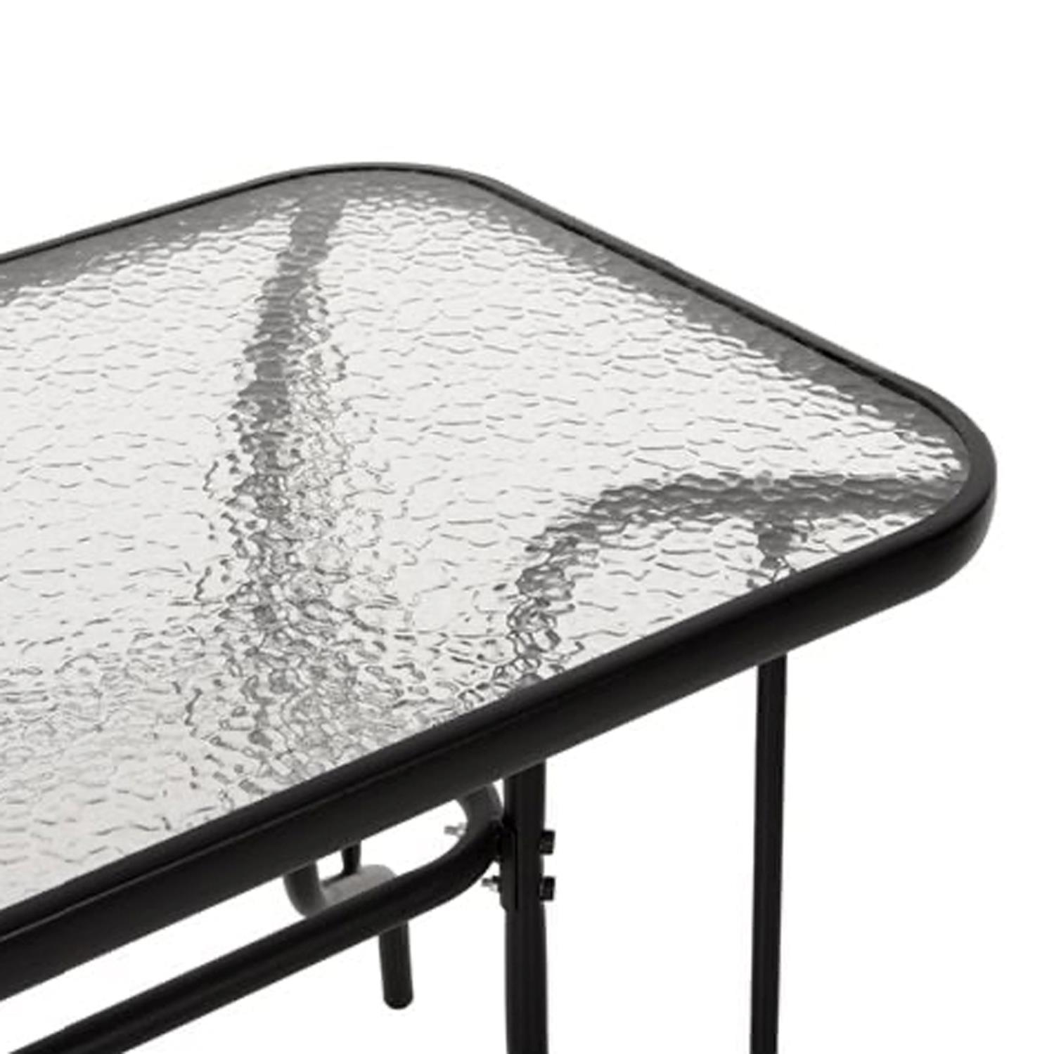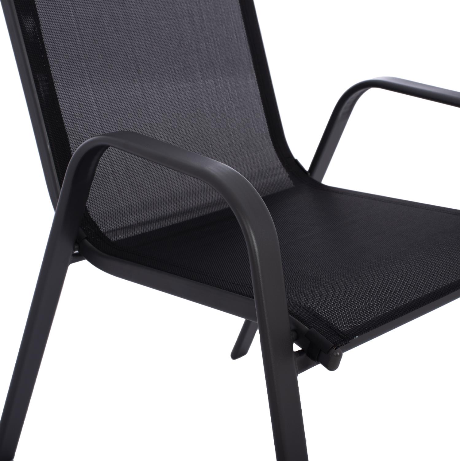 This Outdoor Dining Set features a table with a BLACK metal frame and a REINFORCED glass opaque tabletop, and 4 metal armchairs with a BLACK seat and backrest made of high quality 2x1 (540g) textilene fabric.