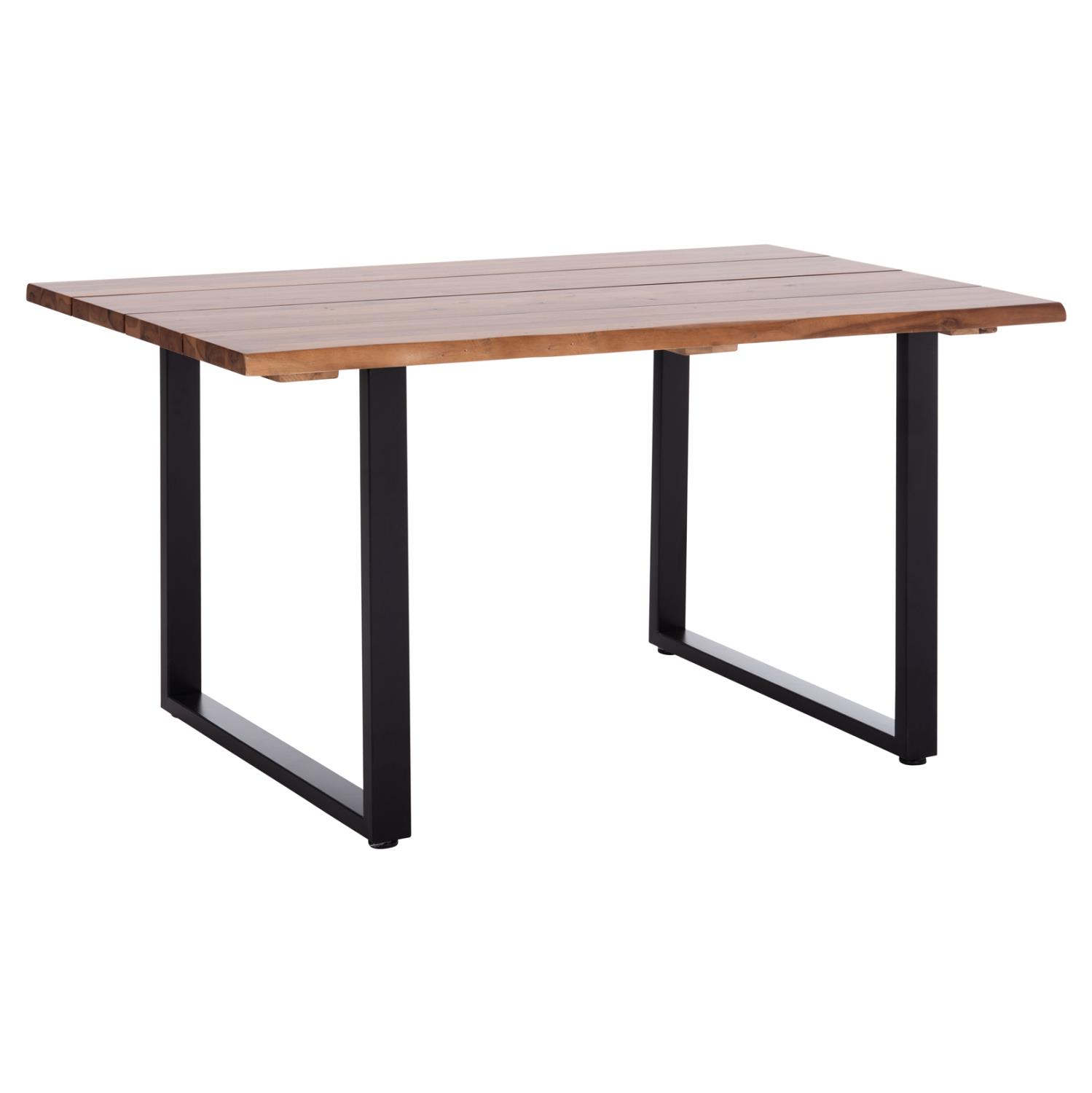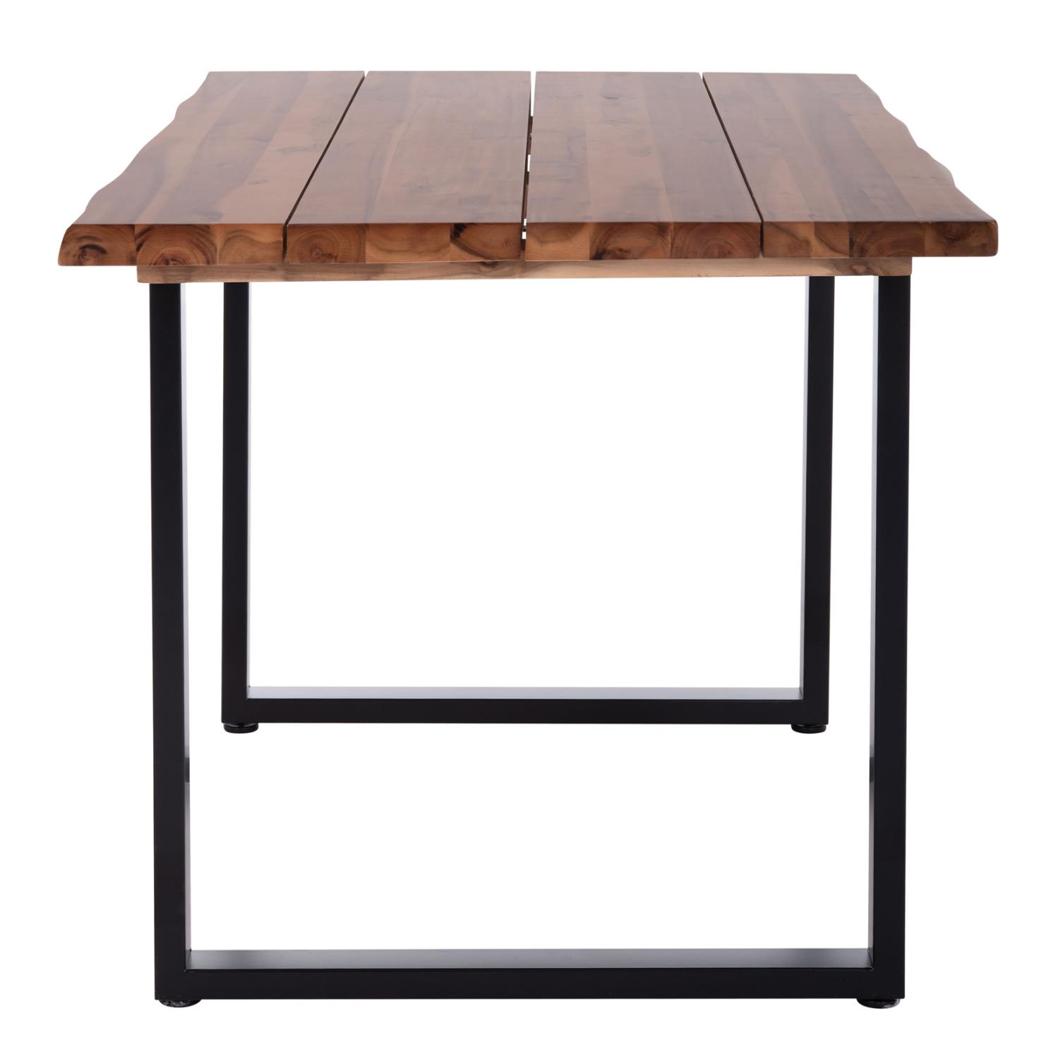 Discover the unique table FRIGGO with natural solid ACACIA wood tabletop in NATURAL color. The shape is rectangular and rests on two black metal bases. The modern design meets nature and gives a timeless and warm feeling to your space.