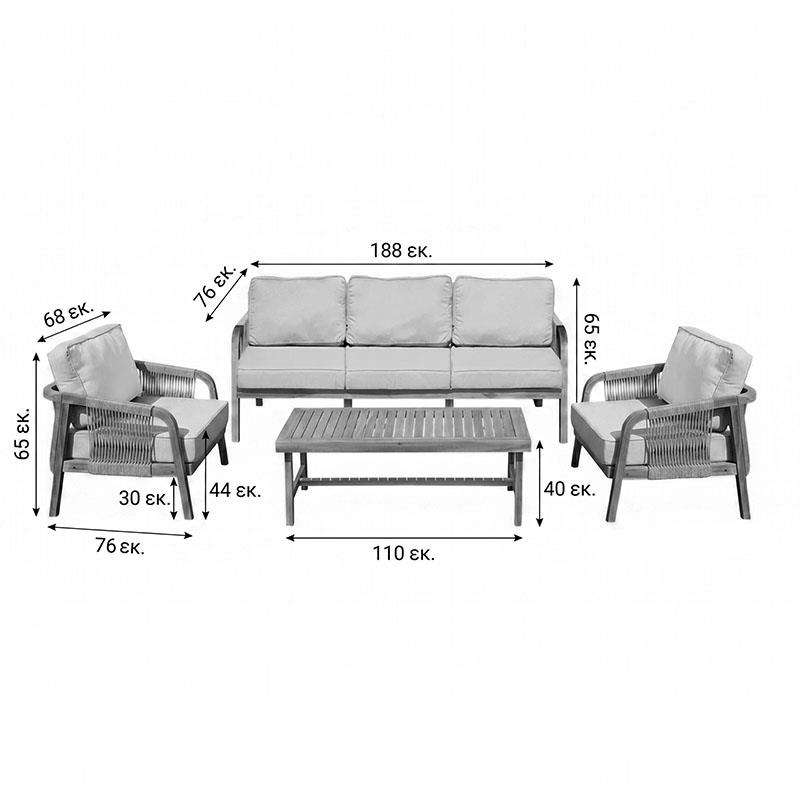 - The upholstery of the two armchairs and the 3-seater sofa is made of 180gsm fabric of unmatched quality in beige.