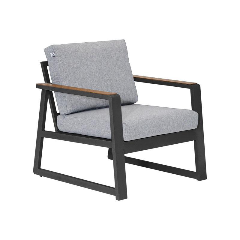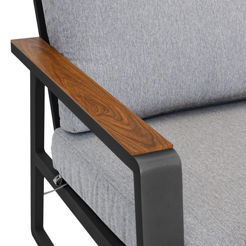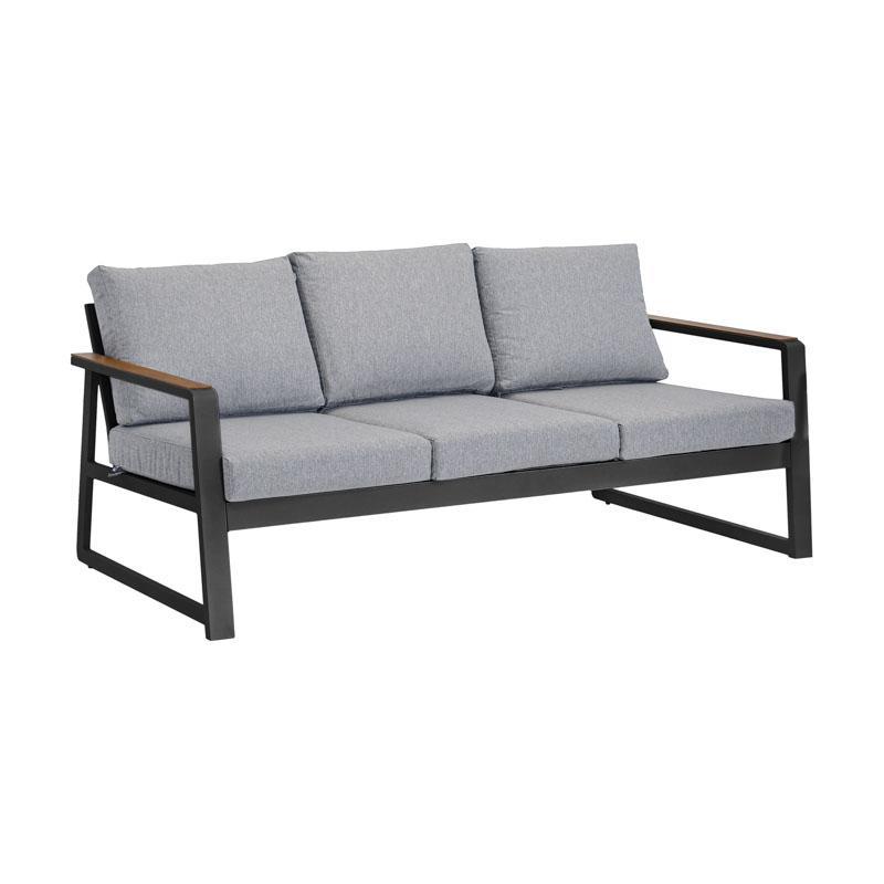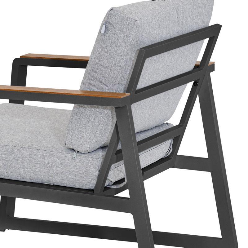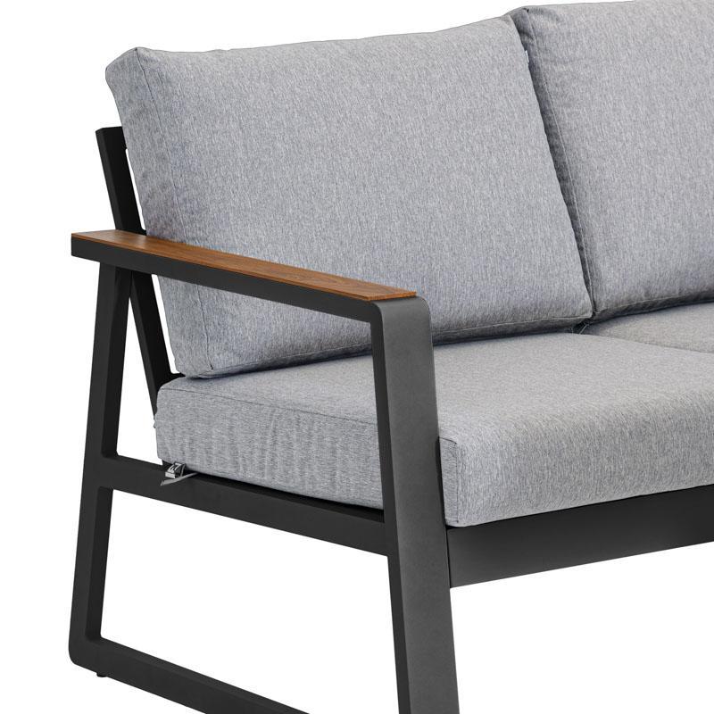 Luxurious and durable Maya aluminum seating set, ideal for outdoor spaces such as gardens, verandas or large terraces. The set includes two single seats, a three-seater sofa, a rectangular table and a stool, all designed for comfort and durability. The powder-coated aluminum frame offers long-lasting protection against rust and weather conditions, while the wide cushions ensure a relaxing seating experience.