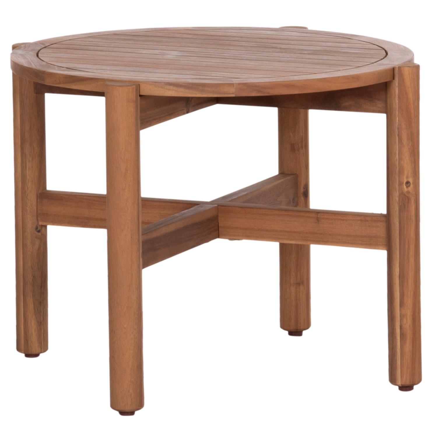SANJI is a quality outdoor round coffee table made of acacia wood in its NATURAL color. The round tabletop rests on a cross base with 4 legs and can be combined with furniture of similar aesthetics.