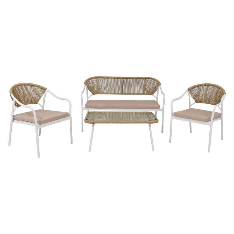 The Fylliana 2133 garden lounge is your ideal choice. It consists of a two-seater sofa, two armchairs and a table. It is made of steel and upholstered with specially treated round wicker. Suitable for domestic and professional use.