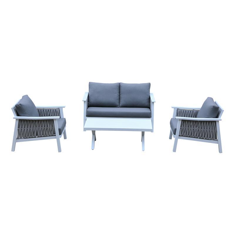 The set includes a three-seater sofa and armchairs with an ergonomic design, ensuring maximum comfort for endless hours of relaxation. The cushions are made of semi-waterproof polycotton polyester fabric and are extremely resistant to weather conditions, while the aluminum frame offers high strength and long-lasting use, even in difficult outdoor conditions.