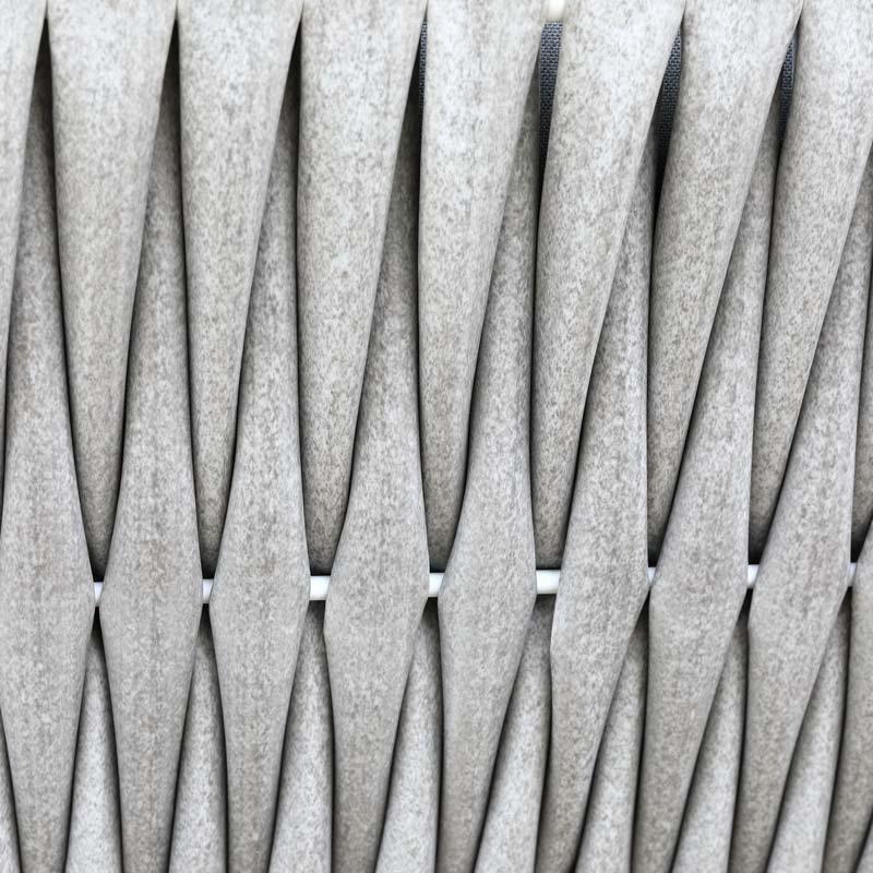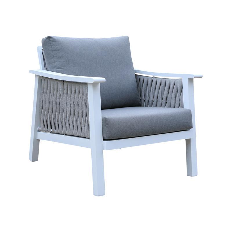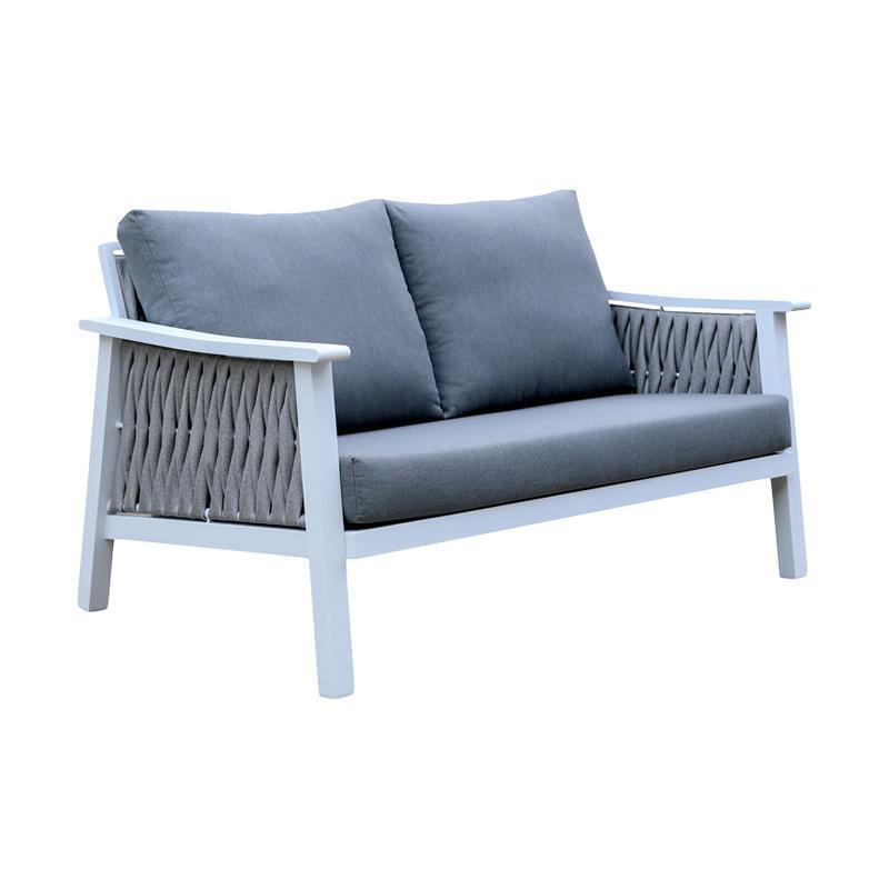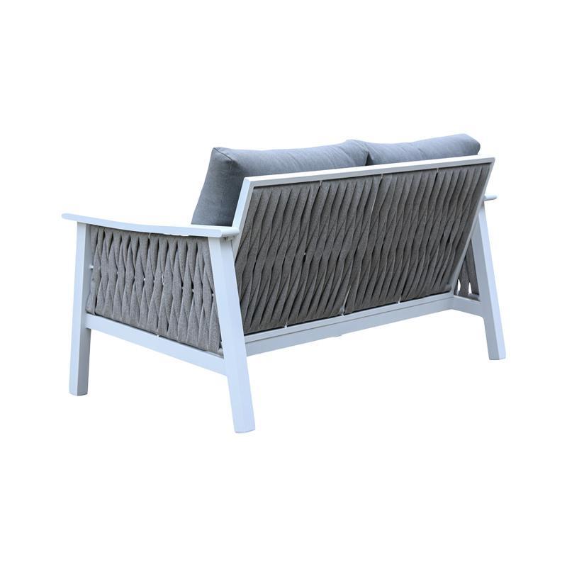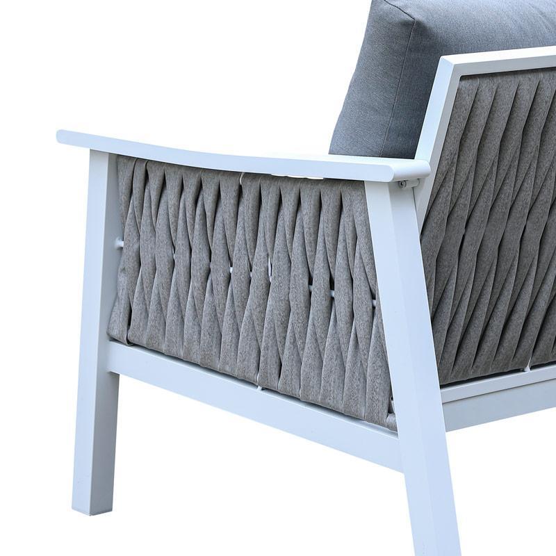Aluminum frame with polyester rope braiding, extremely resistant to sunlight and moisture, soft and resistant to abrasion, and cushions with polyester semi-waterproof polycotton fabric, extremely resistant