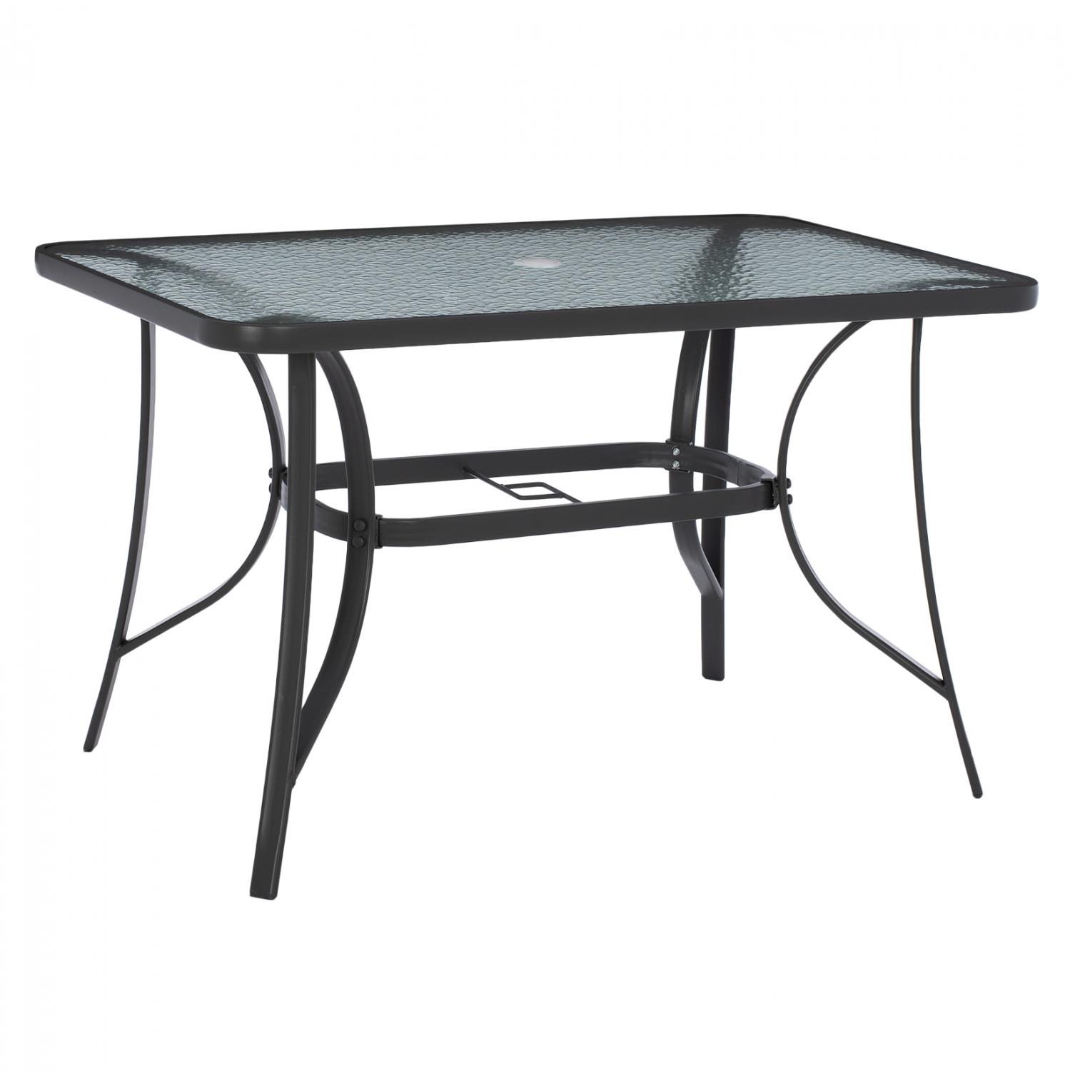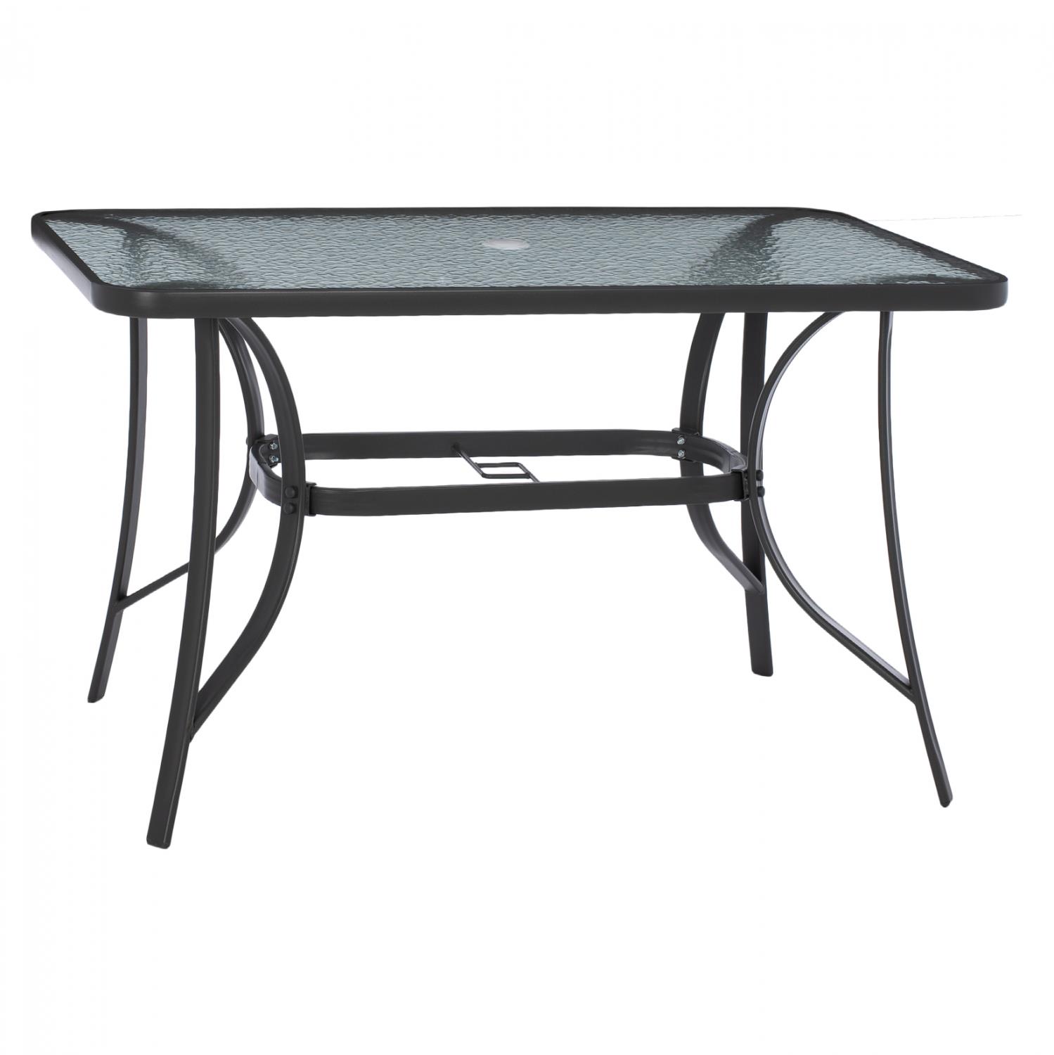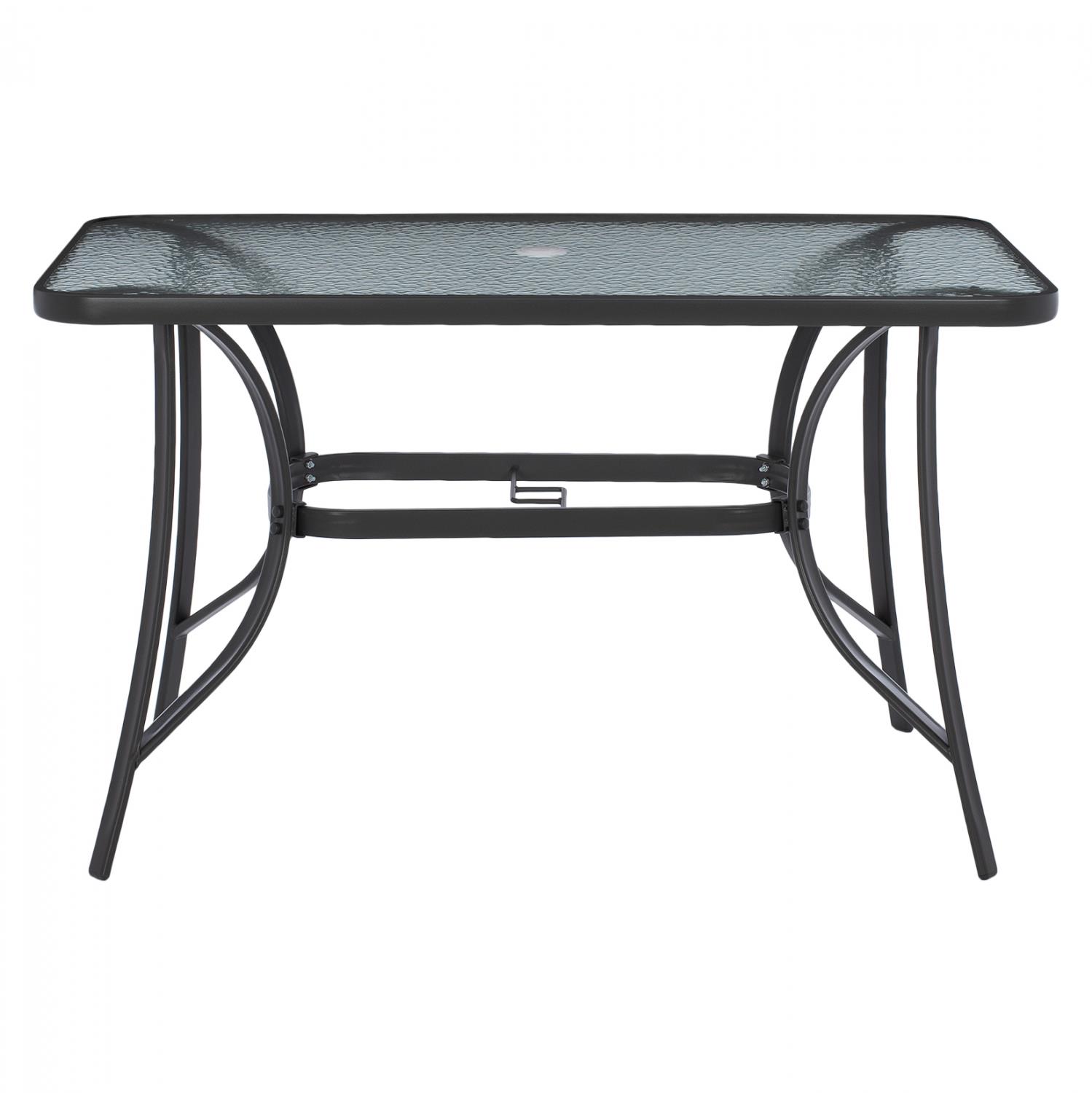 ΗΜ5021.11 BRAVO outdoor table with GRAY metal frame and frosted (opaque) glass surface! This is a very popular table that is not missing from almost any balcony or garden. BRAVO even comes with a hole in the center for placing an umbrella. It is rectangular with rounded corners while the surface glass is reinforced.