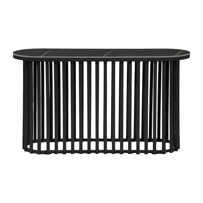 The FL18 oval console combines elegance and minimalist design, making it an ideal choice for entryways, living rooms or dining rooms. Its ceramic surface stands out for its durability and luxurious texture, offering practicality and easy maintenance. The metal base in matte black with clean lines harmoniously supports the surface, providing stability and a modern aesthetic. Its oval shape gives a discreet flow to the space, avoiding strict corners and offering a more friendly feel. Ideal for showcasing decorative objects, lighting or personal items, the FL18 console is a piece of furniture that combines functionality with timeless style.