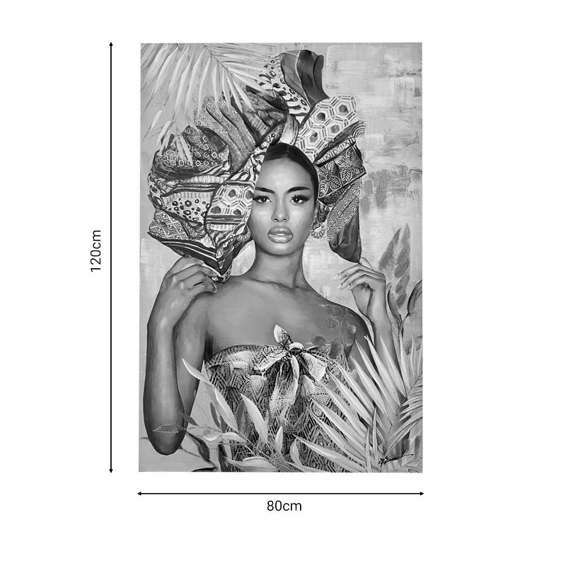 The Bezira painting will decorate your space, giving it a breath of renewal. The woman is presented with refined features, with the gray colors highlighting the underlying intensity and inner strength of the figure.