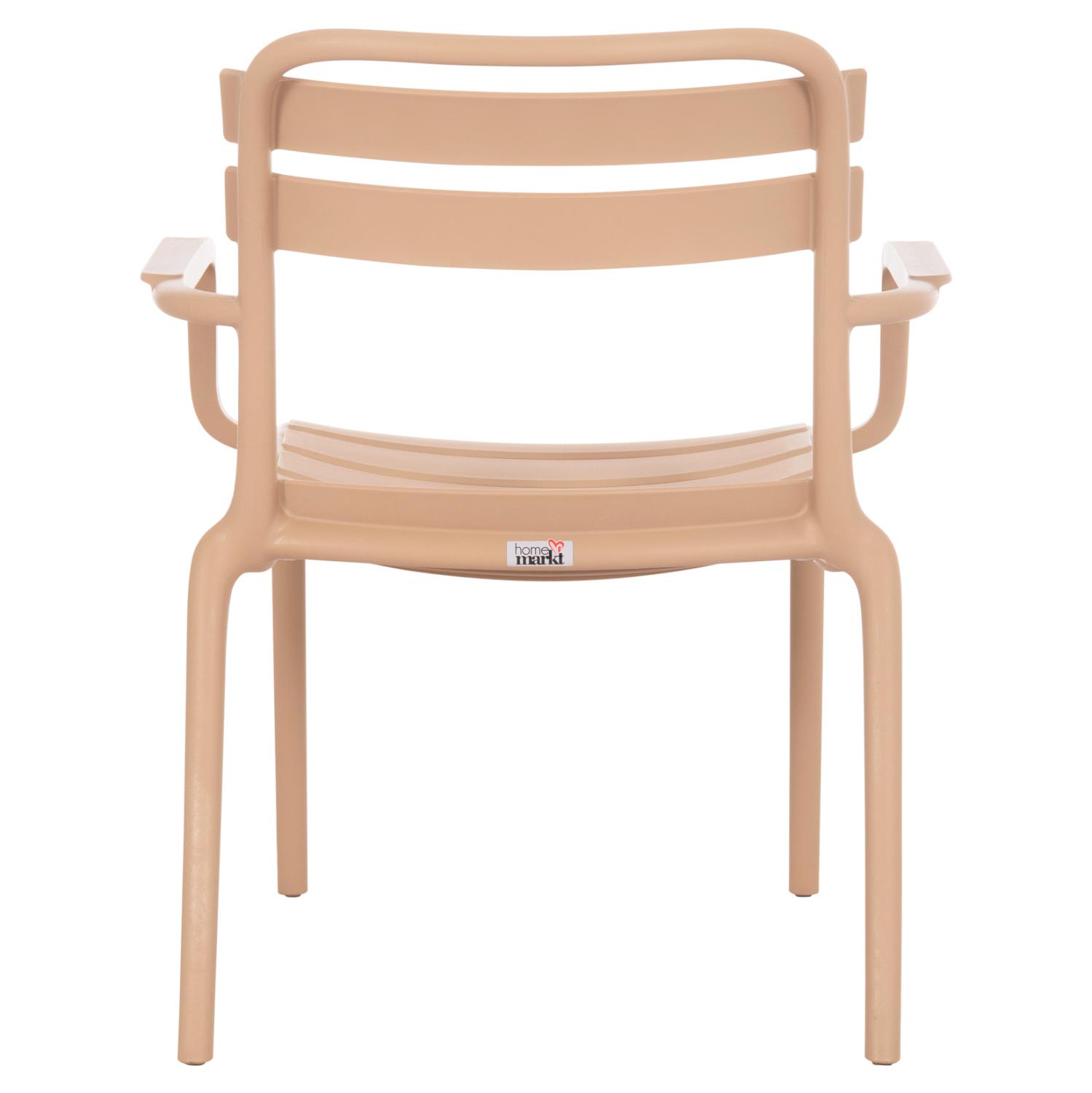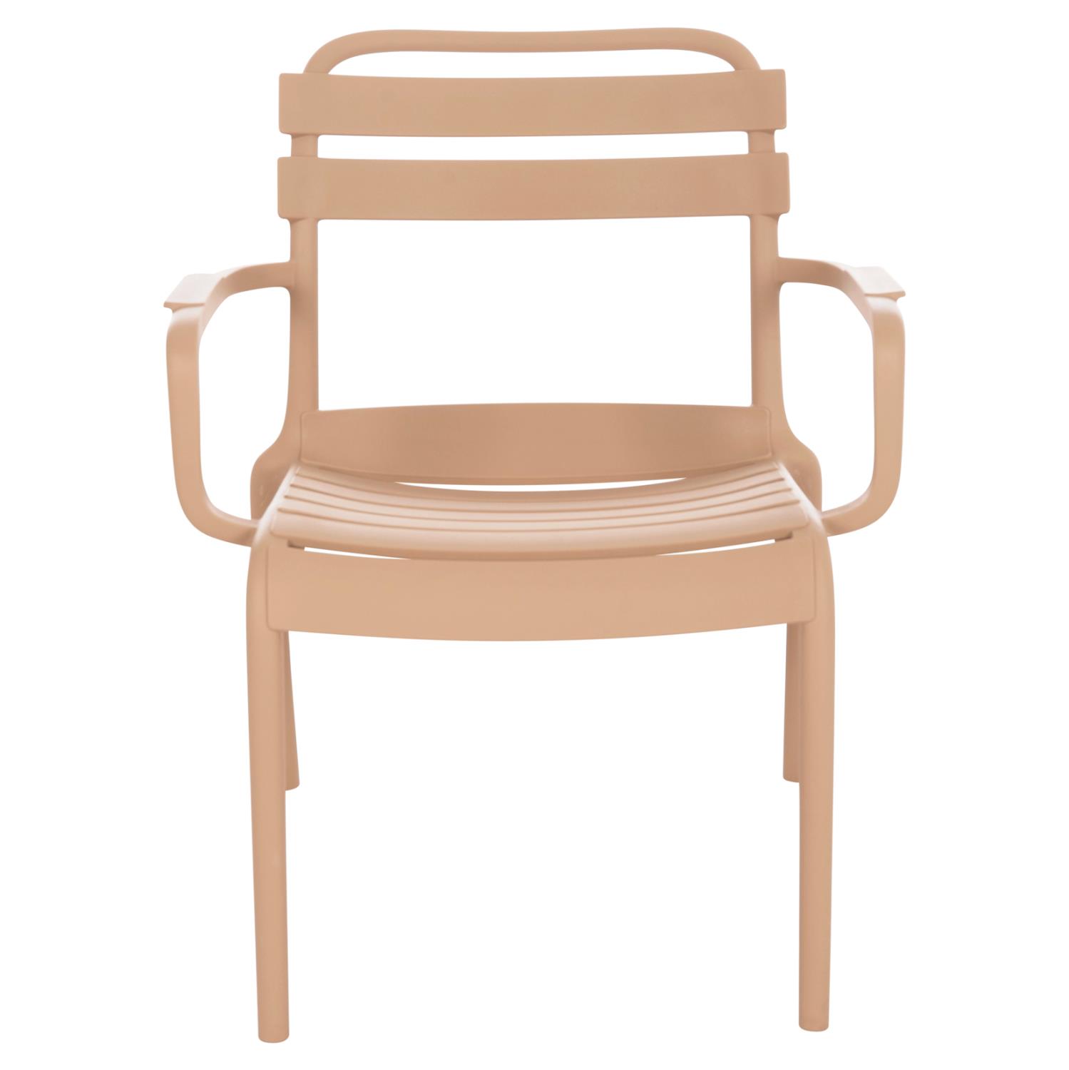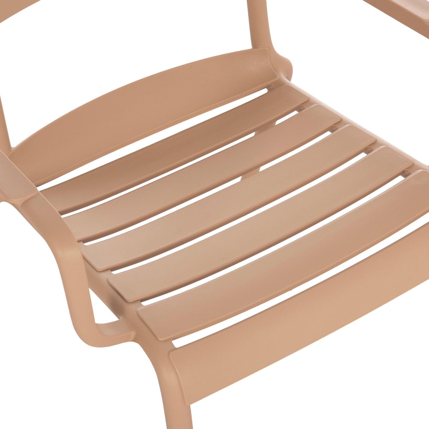 The KORVER lounge armchair is a classic outdoor armchair that will meet your every need in your backyard or balcony. It is of high quality and elegant in appearance, while the curved seat in the front and the tall arms make it very comfortable. The entire armchair is made of polypropylene in CAPPUCCINO color. The armchair is STACKABLE, light, and comfortable, an ideal choice even for professional use, such as in catering, etc.