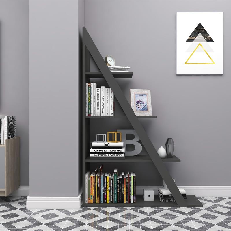 A modern corner bookshelf design with five shelves at different levels, ideal for adding a touch of style and functionality to any space. With its unique design and spacious shelves, it provides a distinctive storage and display solution for books, decorative items, and other personal belongings.
