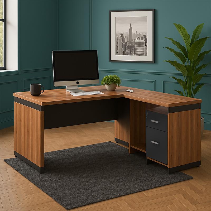 - Side desk: Reversible that rests on the main desk and has multiple storage spaces: Features drawers and shelves.