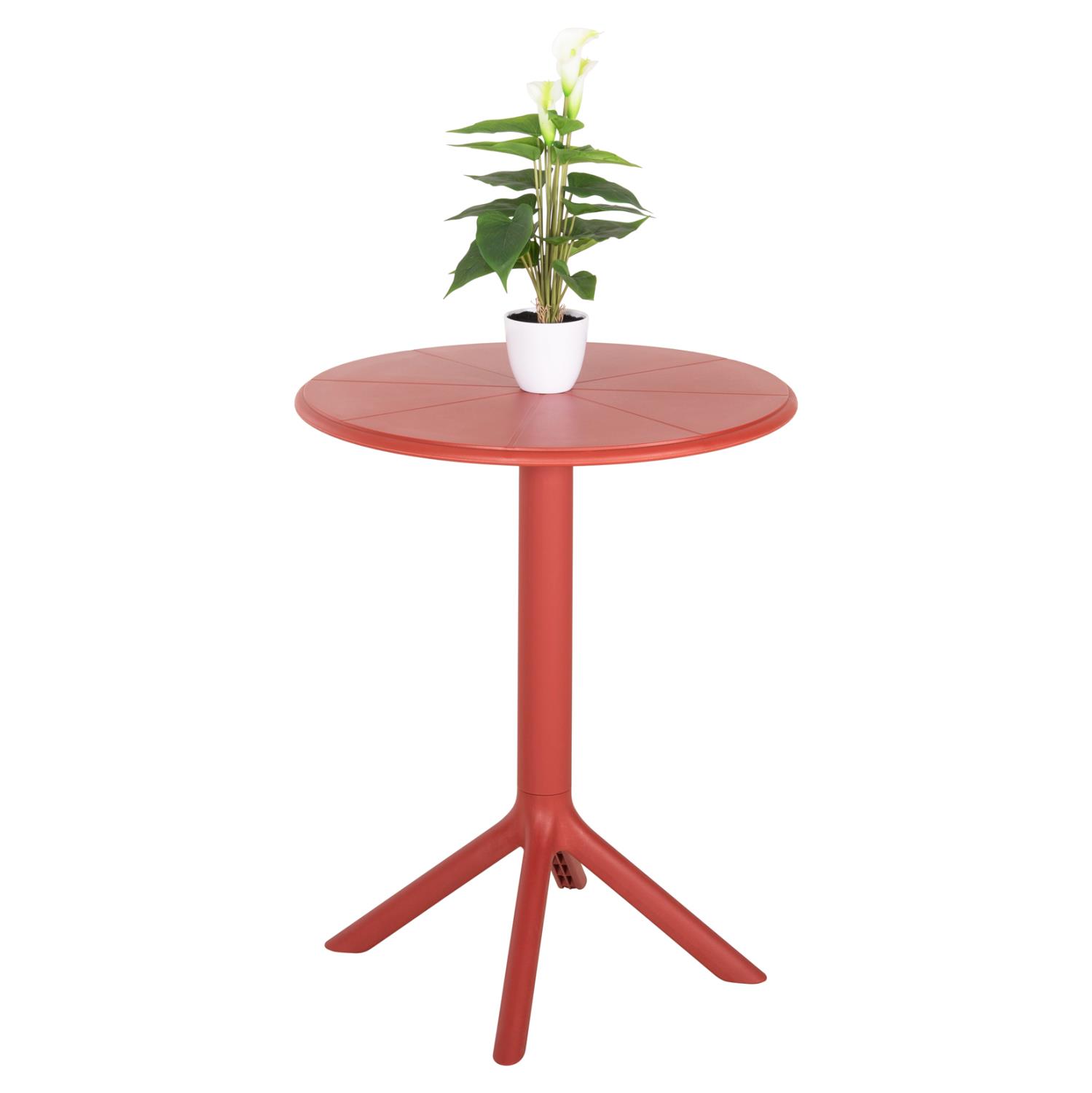 The polypropylene table TERRIN in RED color is the ideal proposal for use in outdoor spaces, whether professional (banquets, catering companies, etc.) or for the home. The table is round, supported by a central column ending in 4 legs.