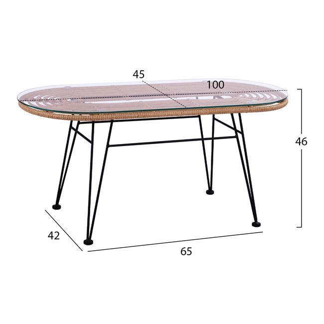 The set includes: 1 two-seater sofa, 2 armchairs and 1 table with glass.