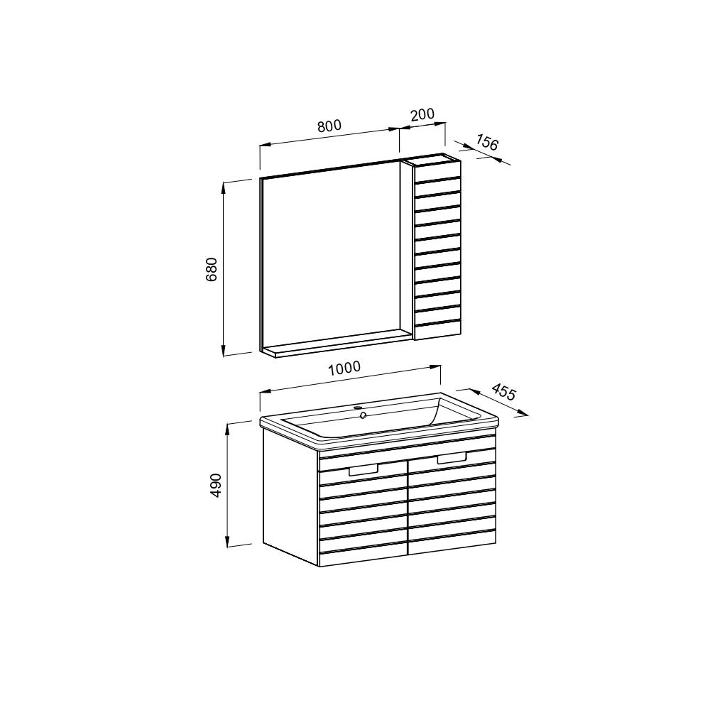 Base Cabinet: Width: 100 cm / Depth: 45.5 cm / Height: 49 cm