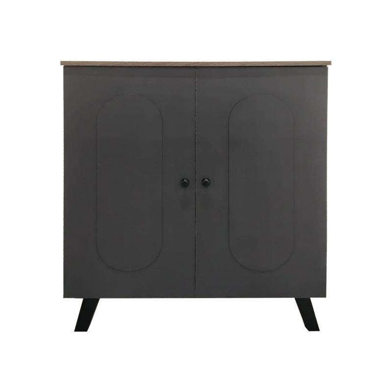 It features two doors with distinctive oval shapes and subtle round handles, adding a playful yet refined aesthetic to your space. Its interior offers ample storage space for organizing your footwear. The color contrast adds pleasant visual interest. The unit stands on four legs that enhance its modern style and ensure stability.