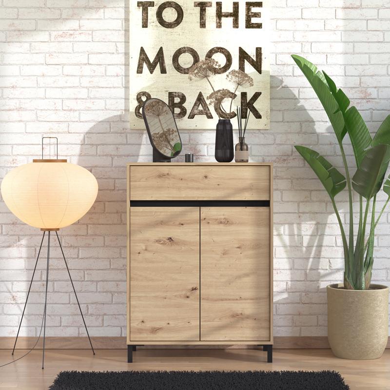 The Flannan shoe cabinet offers stylish storage and practical organization for your entryway or hallway. The modern combination of natural Artisan Oak with a matte black finish gives a sophisticated and timeless aesthetic that suits any decor style.