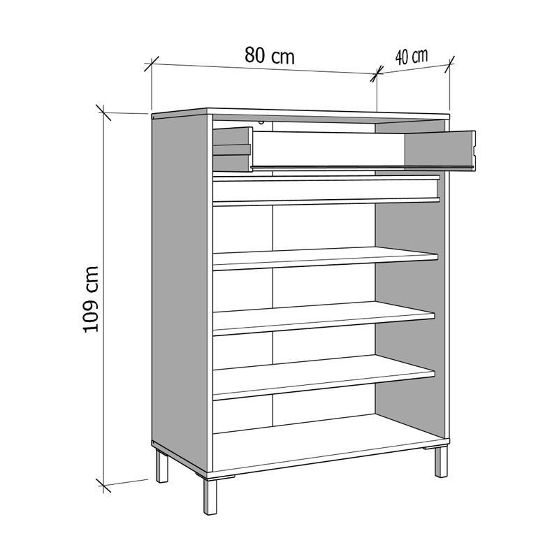 It features a functional drawer at the top, ideal for small items such as keys, wallets or everyday accessories. The cabinet with 4 internal shelves offers plenty of space for storing shoes, keeping your space clean and organized.
