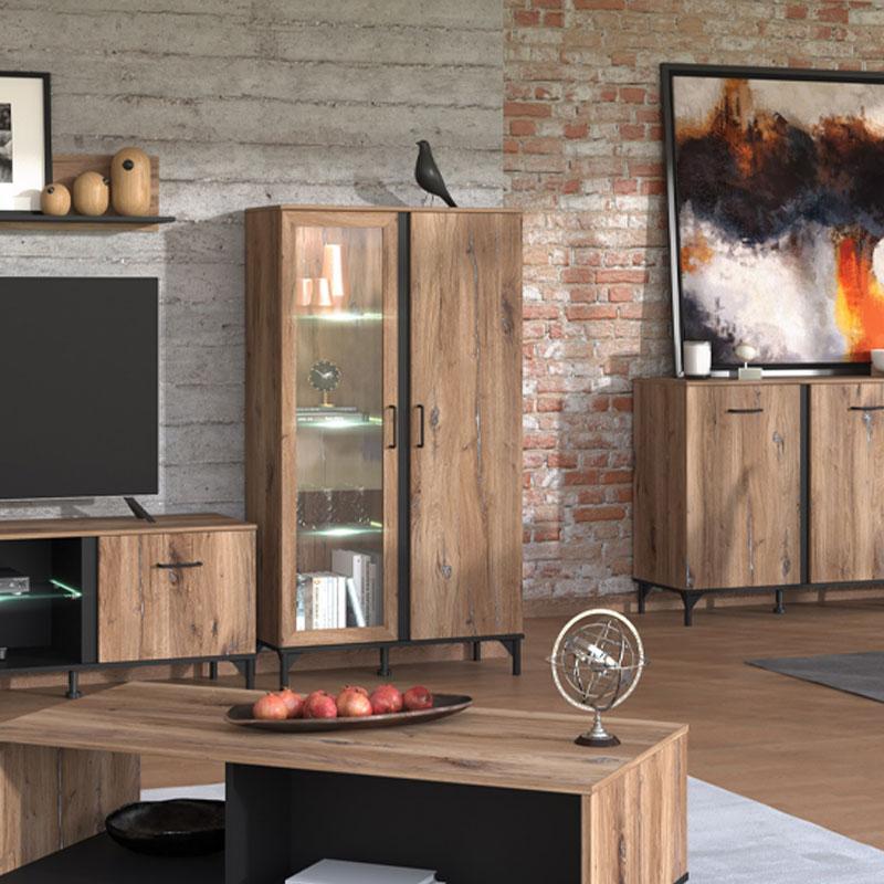 The Corsica display cabinet offers ample storage space, as it has closed and open shelves, allowing you to display decorative items but also store smaller items away from dust. It is made of high-quality materials, such as E1 certified melamine-coated chipboard, which offers durability and easy maintenance. The black metal handles complete the design, giving it a modern and slightly industrial character.