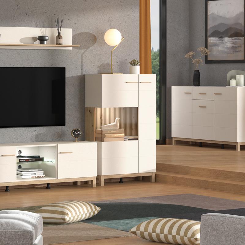 The metal handles give a modern feel to the furniture and facilitate daily use. The applied 2D wrapped MDF profile ensures excellent durability and quality, offering additional style and refinement to the appearance of the furniture. This display cabinet combines practicality and modern design, making it ideal for any modern living room or sitting room.