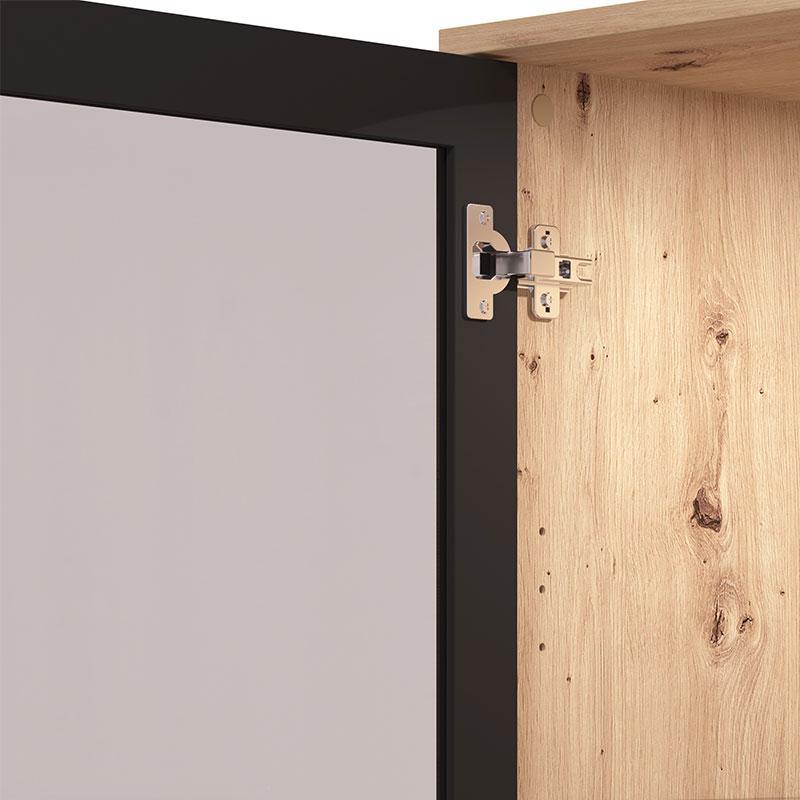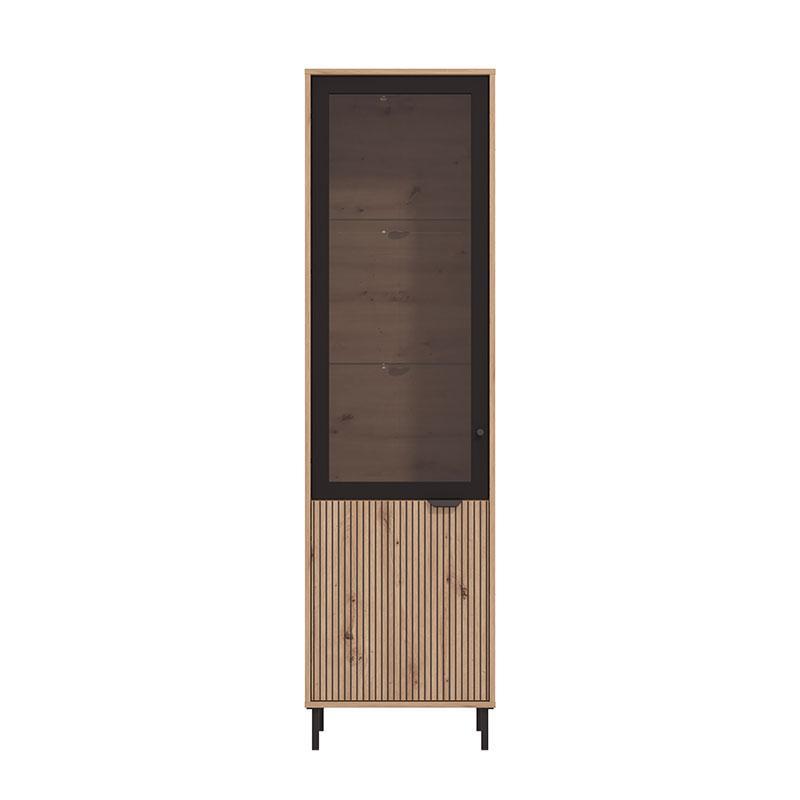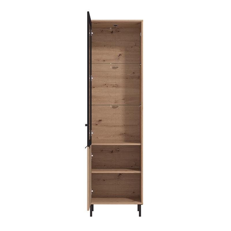 The two-tone artisan oak with black lines and matte black creates an impressive combination, ideal for both modern and more classic spaces. Its minimal and industrial character makes it a versatile choice that can be adapted to various decoration styles. The natural color of the wood offers warmth to the space, while the dark details add an elegant contrast, making the Mayenne display cabinet timeless and impressive.