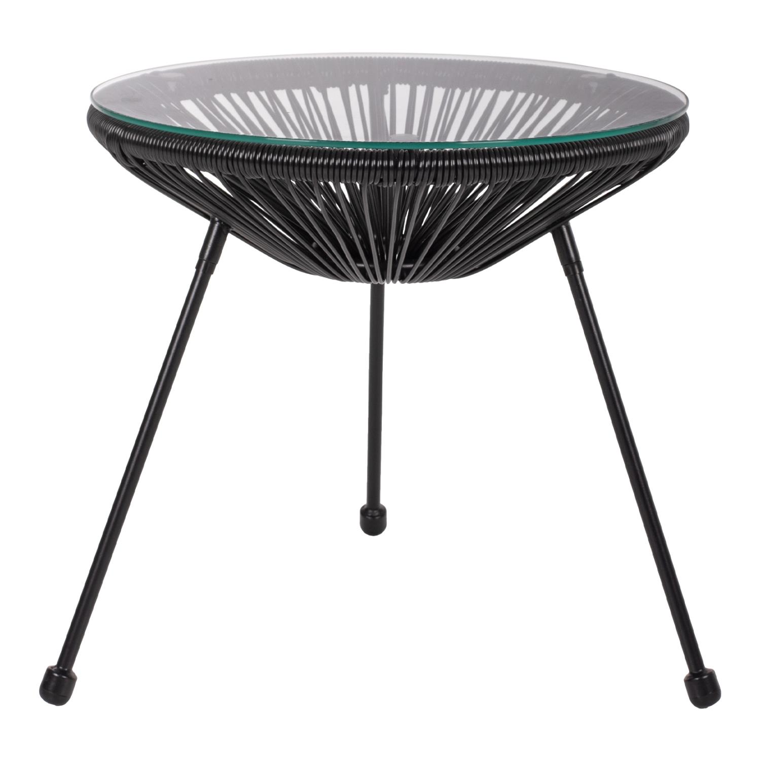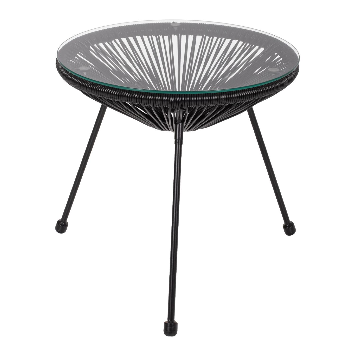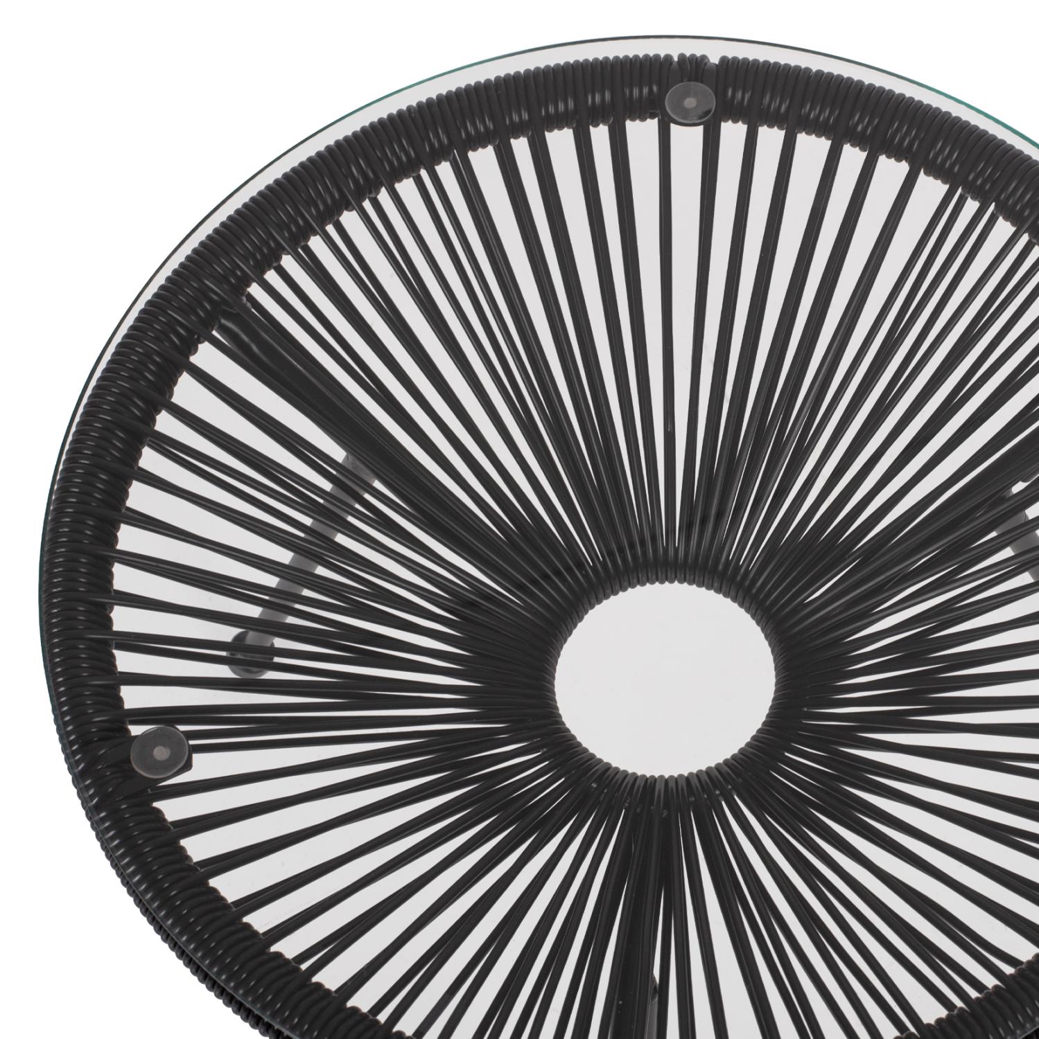 ALLEGRA is a short round side table, mainly for professional use. It rests on a base with 3 black metal legs. The table is conical in synthetic Rattan also in black, and its surface is safety glass. A beautiful table, which if combined with chairs of the same series will be an amazing part of your space.