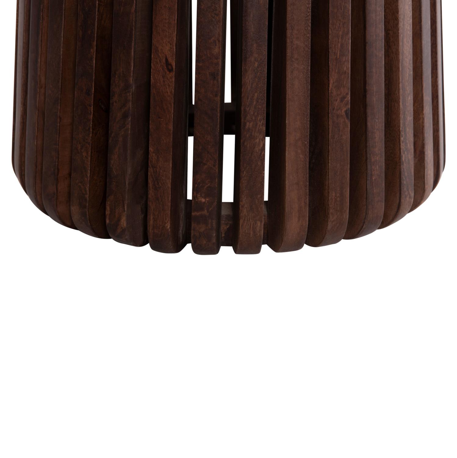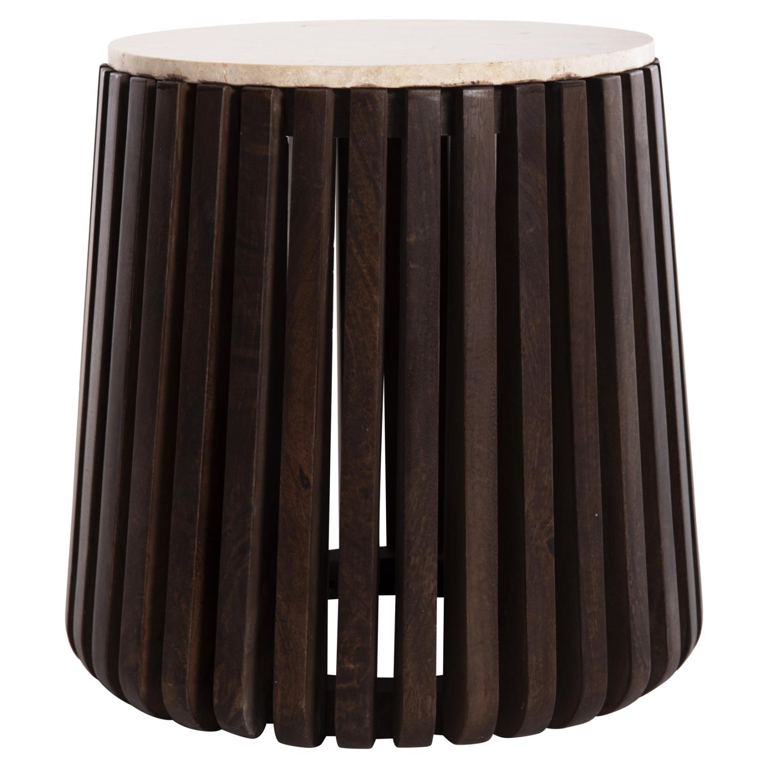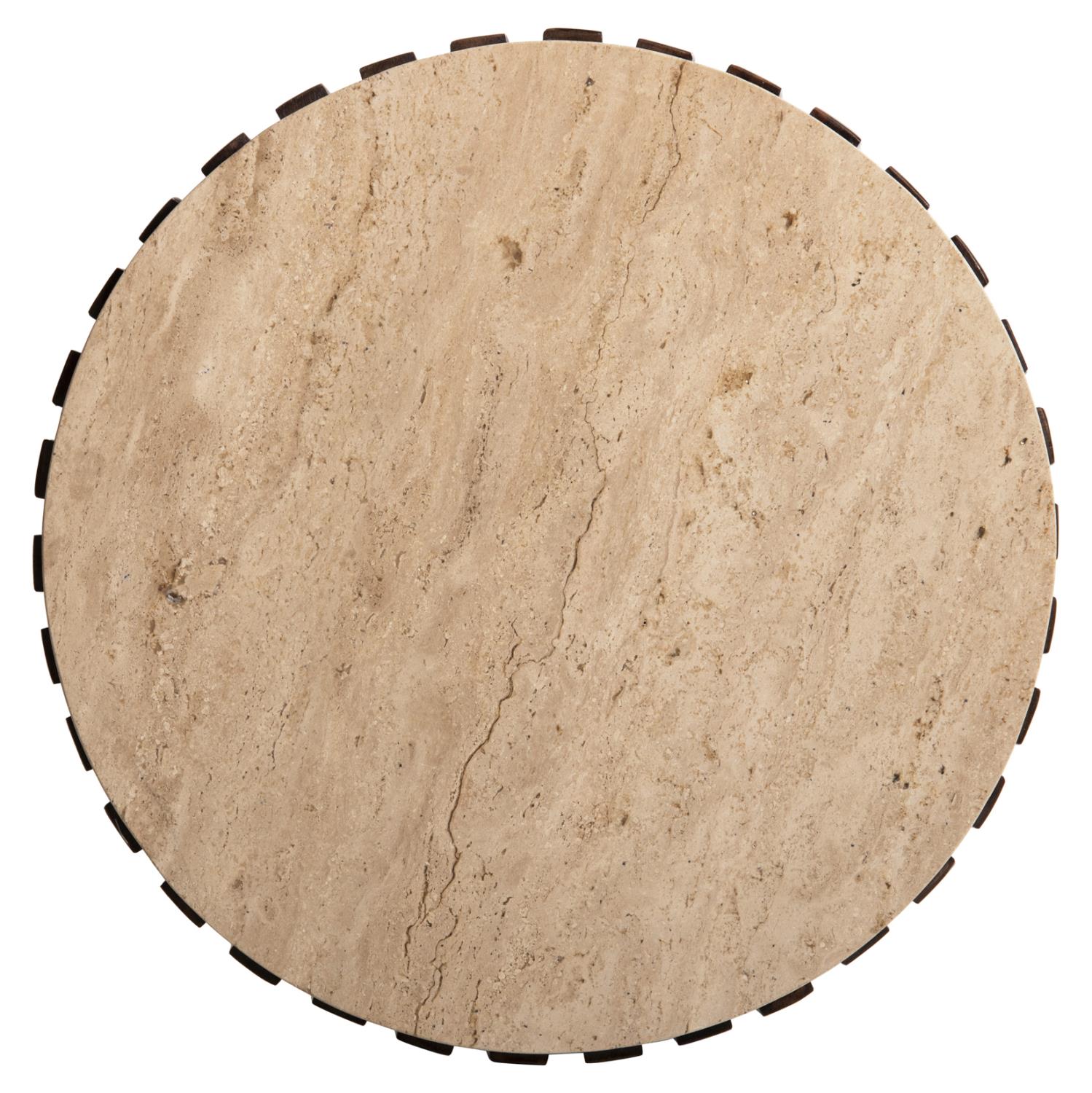 KREST is a round side table in BROWN color with a travertine tabletop in its WHITE color. It consists of wooden beams in a conical arrangement that end in a circular base, on which the stone tabletop is placed. This is a luxurious side table for your living room that will catch the eye!