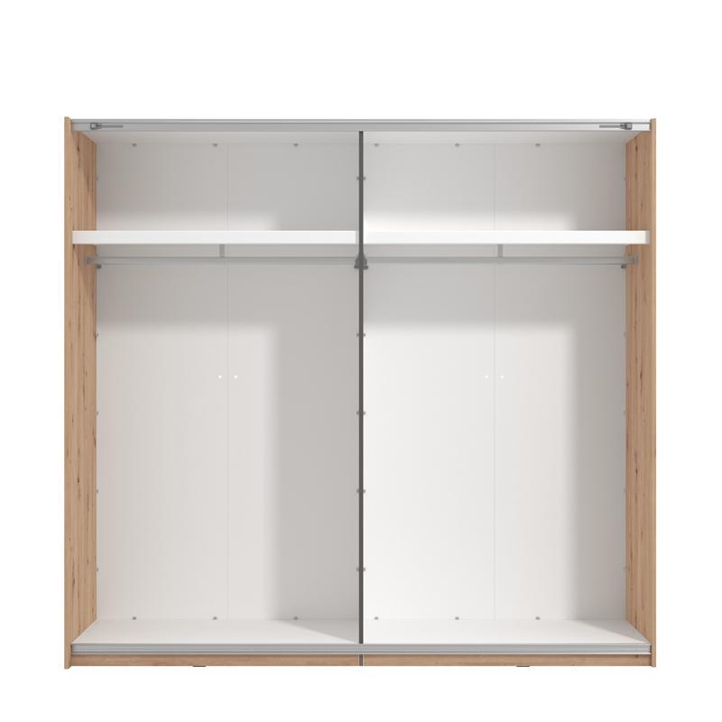 The Aleria 220 sliding wardrobe features two sliding doors, one of which includes a mirrored section, offering additional functionality and convenience for everyday use. The mirror is harmoniously integrated into the design of the wardrobe, allowing for ease of use without taking up additional space in the room. The interior layout of the wardrobe includes two shelves, which provide ample space for storing smaller items, such as clothes, accessories or personal belongings. In addition, the wardrobe features two separate areas with a clothes rail, allowing for the storage of larger items, such as dresses, coats or shirts, without them getting wrinkled.