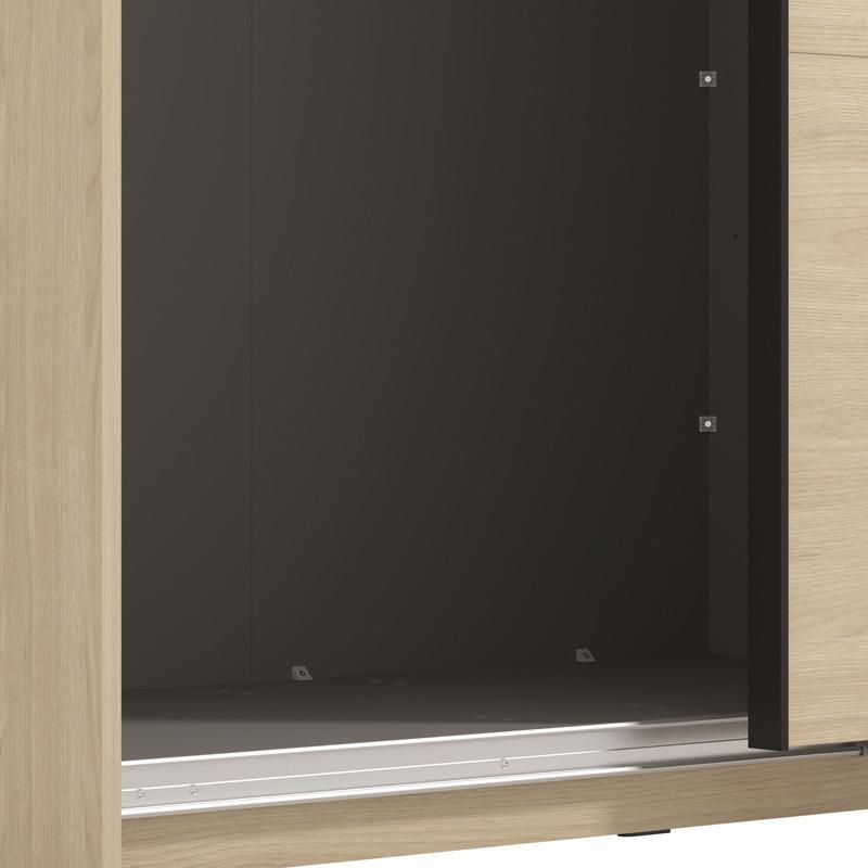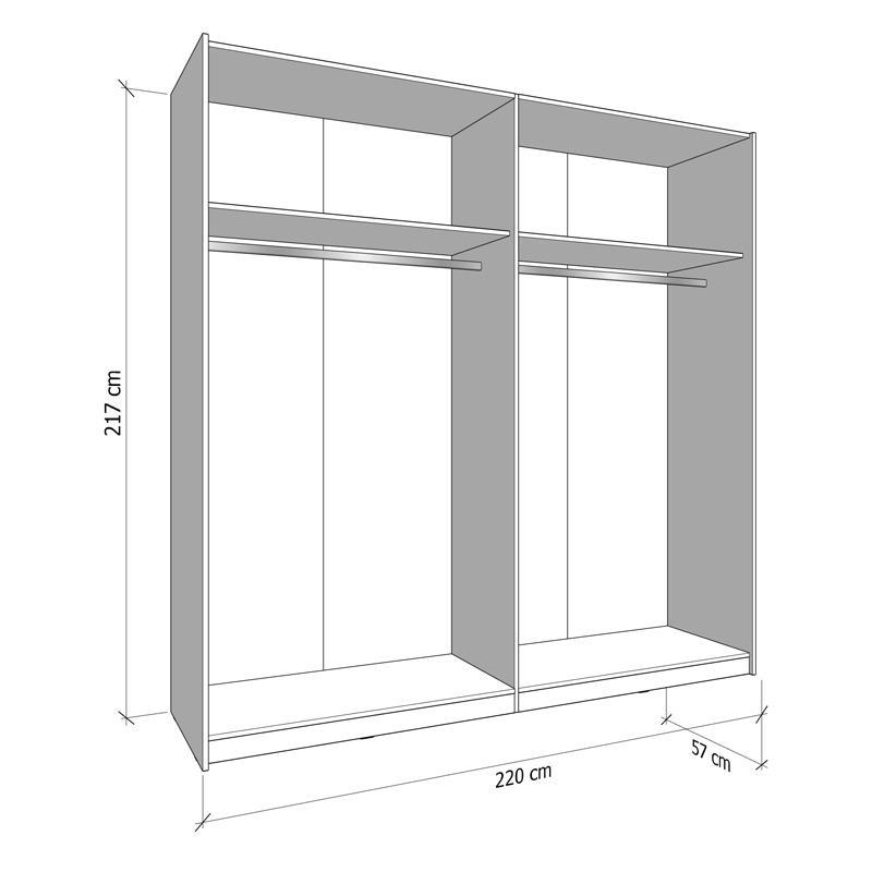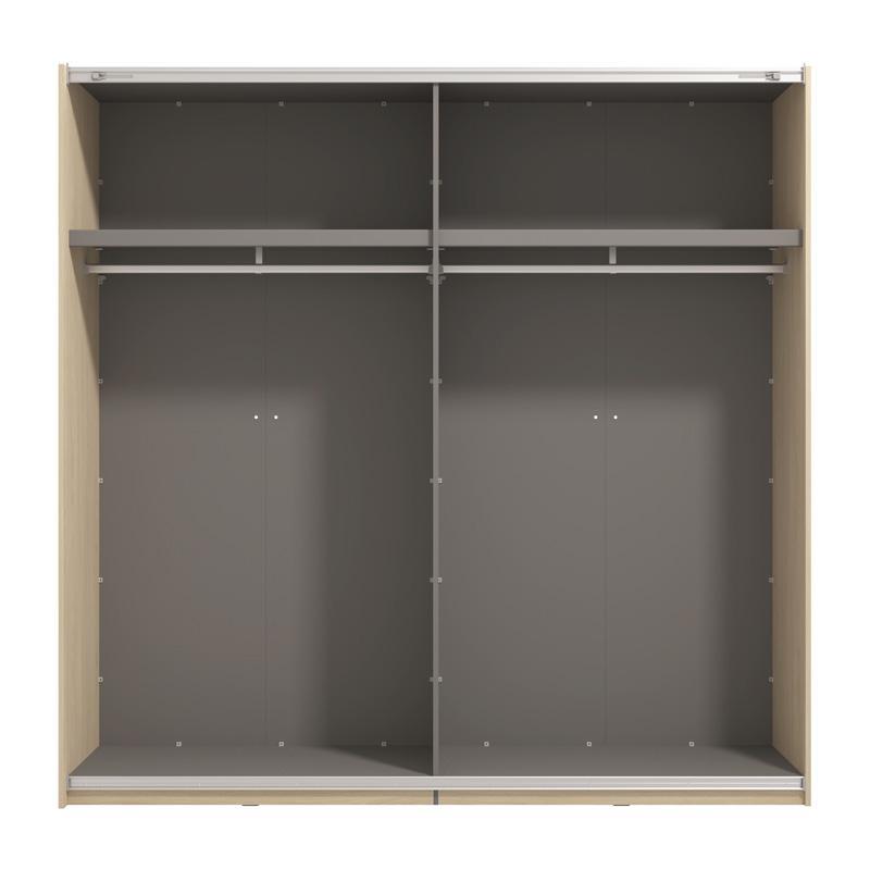 The Arbela 220 sliding wardrobe features two sliding doors, one of which includes a mirrored section, offering additional functionality and convenience for everyday use. The mirror is harmoniously integrated into the design of the wardrobe, allowing for ease of use without taking up additional space in the room. The interior layout of the wardrobe includes two shelves, which provide ample space for storing smaller items, such as clothes, accessories or personal belongings. In addition, the wardrobe has two separate areas with a clothes rail, allowing for the storage of larger items, such as dresses, coats or shirts, without them getting wrinkled.
