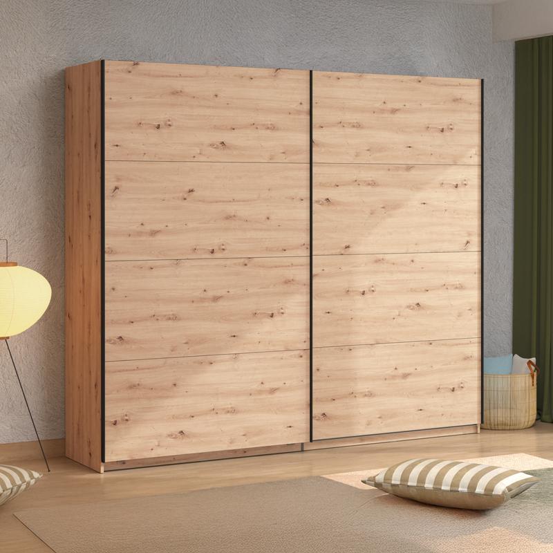 It is made of high quality materials, with certified European melamine and MDF coating on its facade, in a special artisan shade, which offers discreet luxury and brightness to the space in combination with the black matte metal handle it has. The Gard 245 double-leaf sliding wardrobe combines style and organization in one, as it follows the latest design trends.