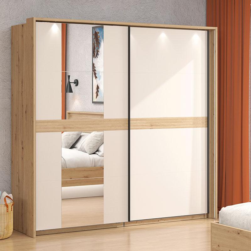 Made of certified high-quality European melamine, in a special and elegant combination of artisan oak and cashmere shades, the MODENA 245 OG double-leaf sliding wardrobe guarantees durability and lasting elegance. A choice that combines modern design and functionality, offering you the class and style you are looking for in your space.