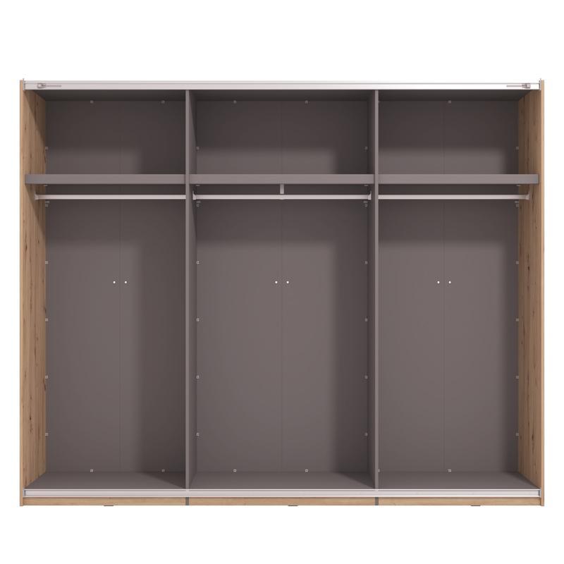 Its interior is designed for maximum ergonomics as it features three identical sections, each with a shelf at the top and a metal hanging rail, for comfortable organization of your clothes and coats. In addition, there is the possibility of adding additional shelves, a set of drawers or a slow motion closing mechanism, from the optional equipment, to customize the wardrobe according to your needs.